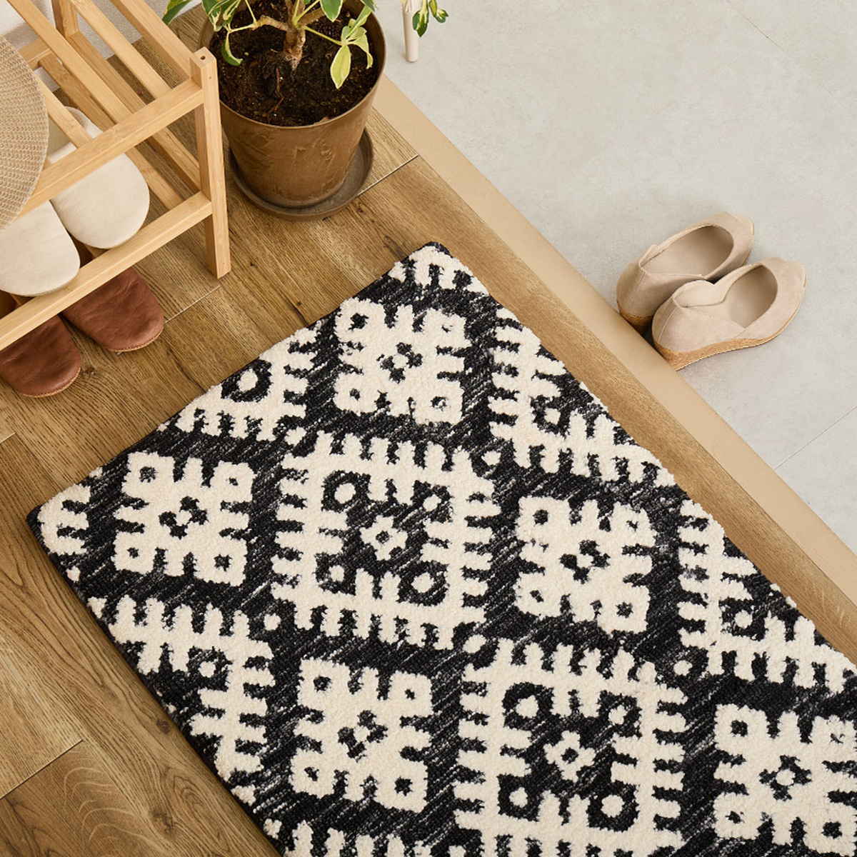希少なモノトーン柄で、空間にさりげない個性をプラスします。シンプルな中にも洗練された表情を演出し、玄関はもちろん、ベッドサイドにもおすすめです。