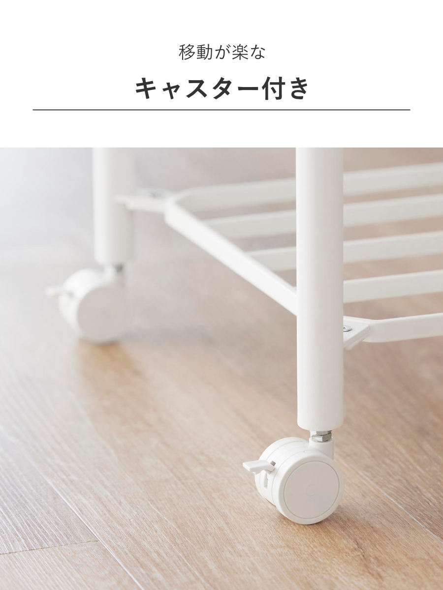 移動に便利なキャスター付きです。掃除の際や荷物を運びたい時に簡単に移動できます。キャスターにはストッパーが付いており、普段は固定しておけば動かないので安心です。