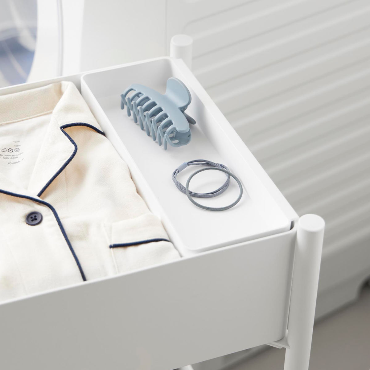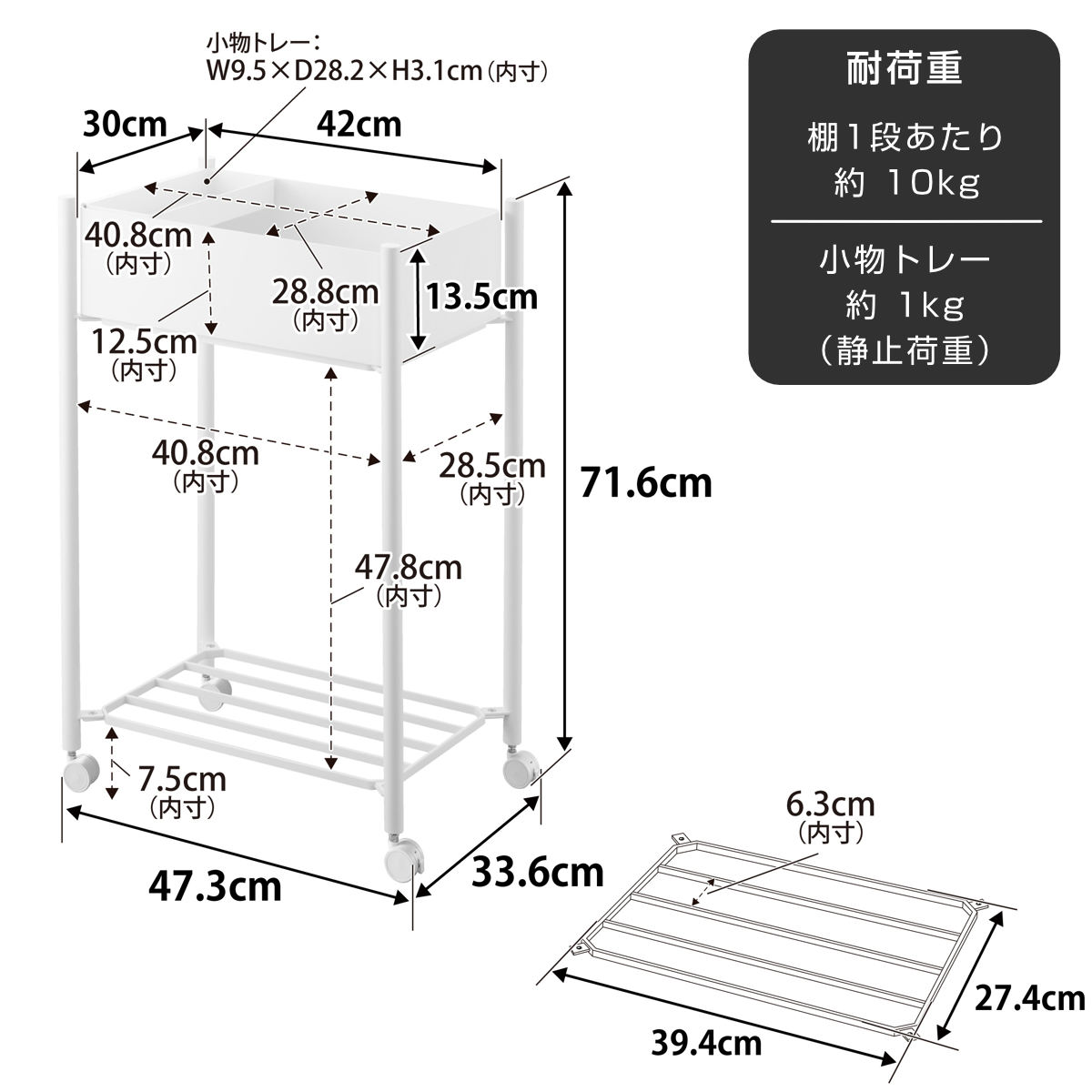 | 材質 | 棚・支柱:スチール(粉体塗装) バスケット・小物トレー:ABS樹脂 キャスター:ナイロン |