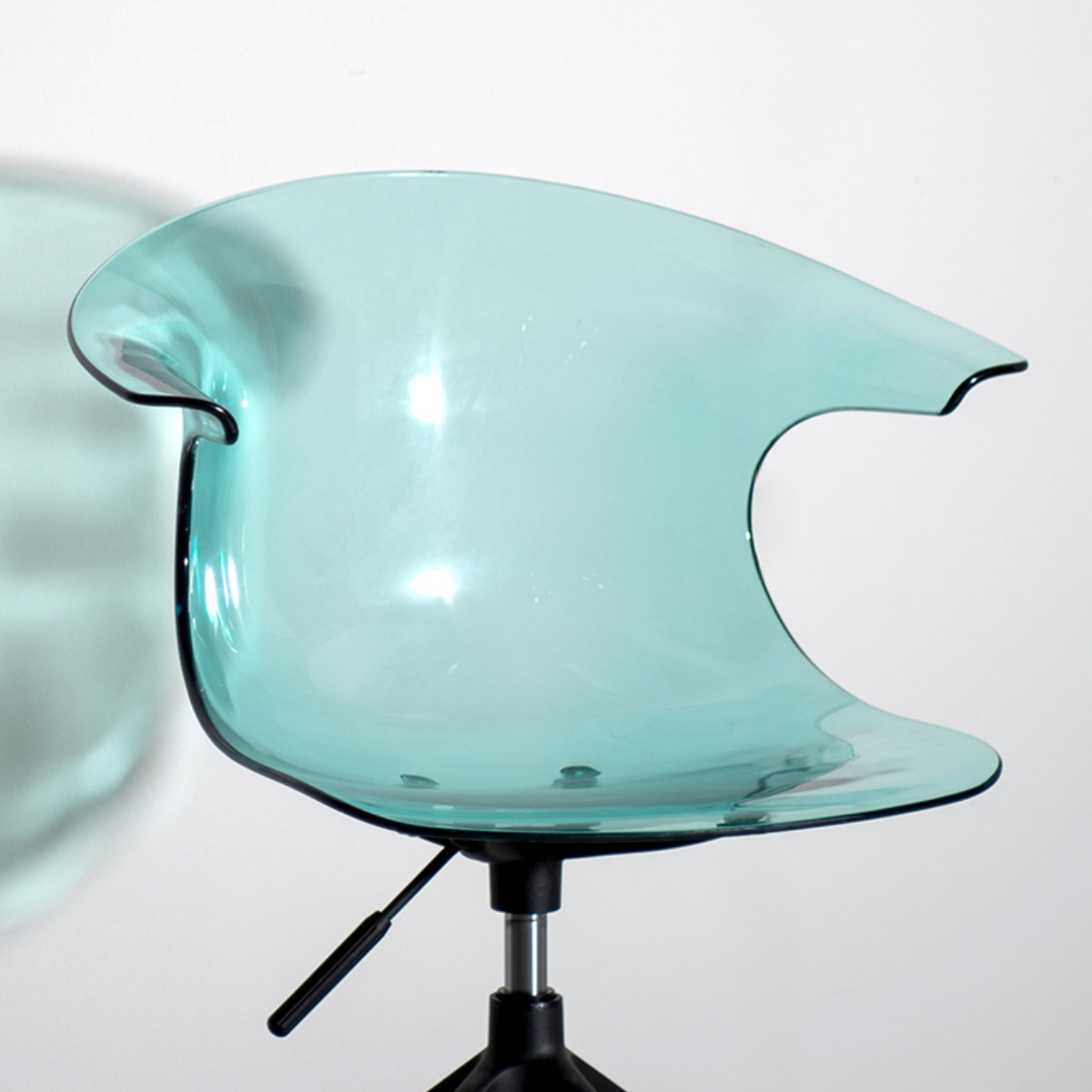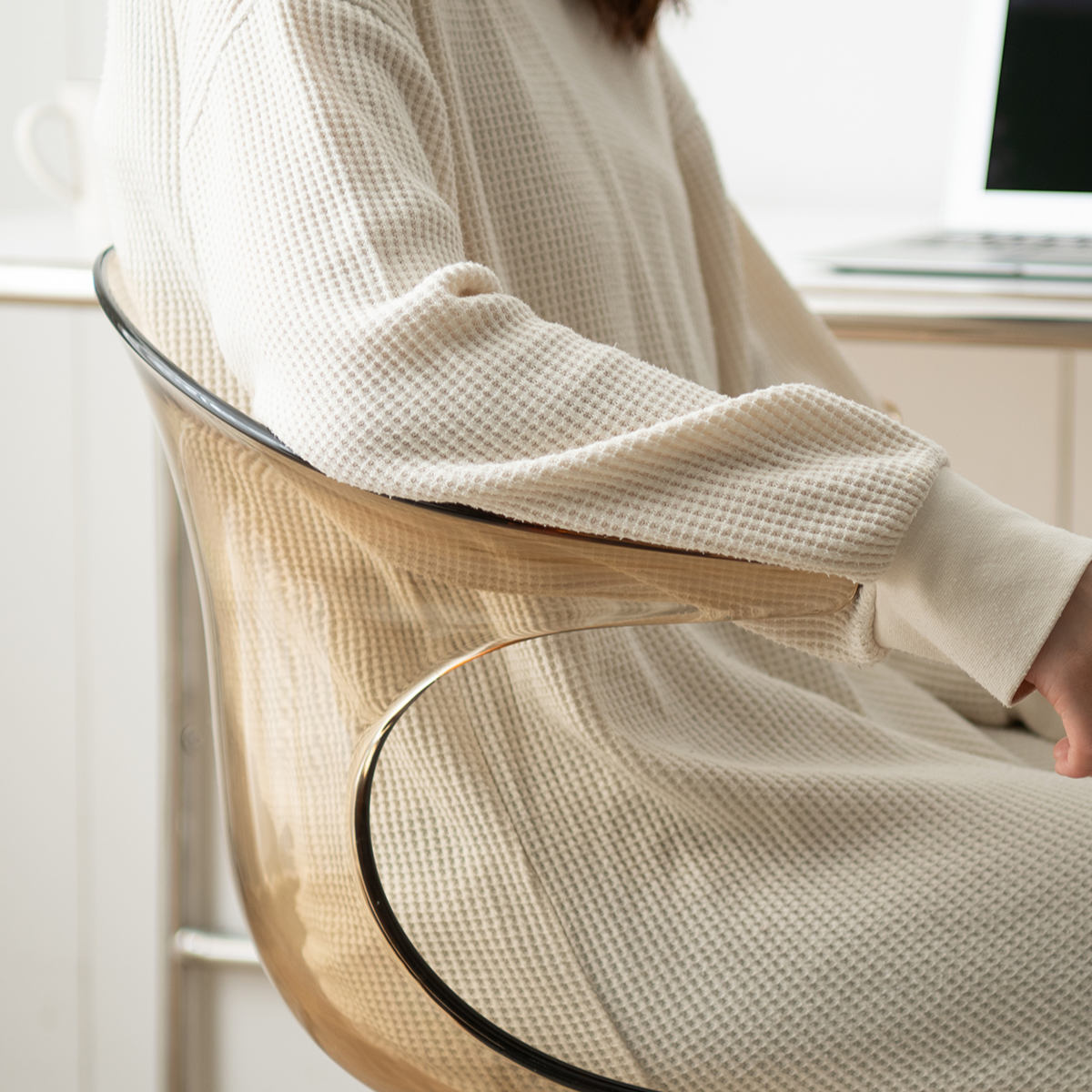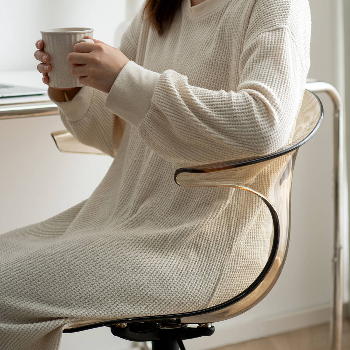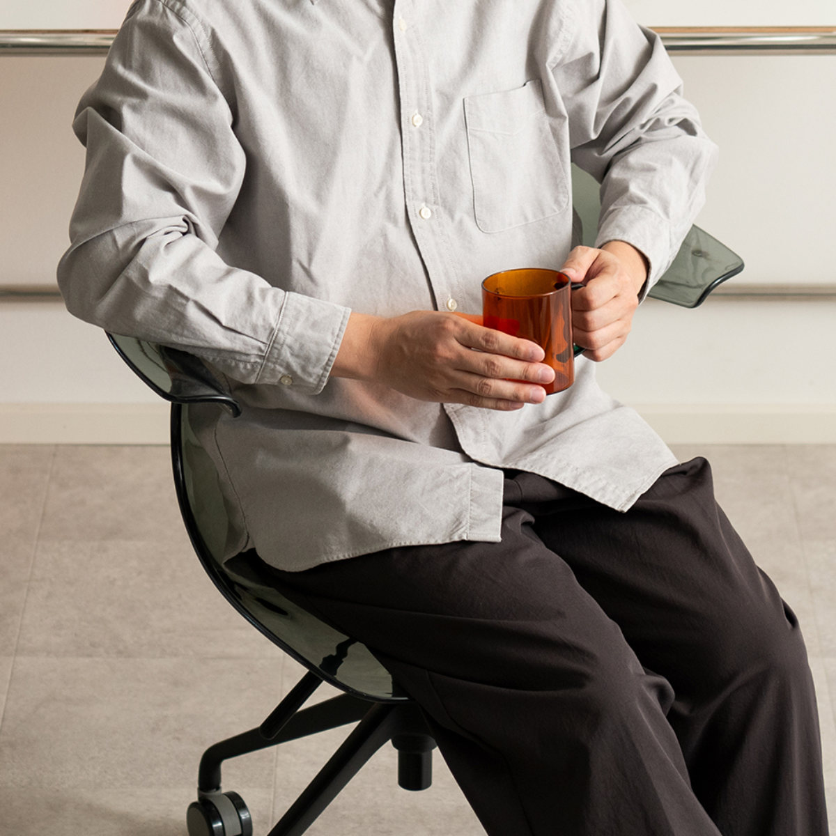 座面と背もたれ部分にはポリカーボネート樹脂を使用しています。ガラスのように透明度が高く、美しい見た目です。耐衝撃性に優れた素材で割れにくく、安心してお使いいただけます。
