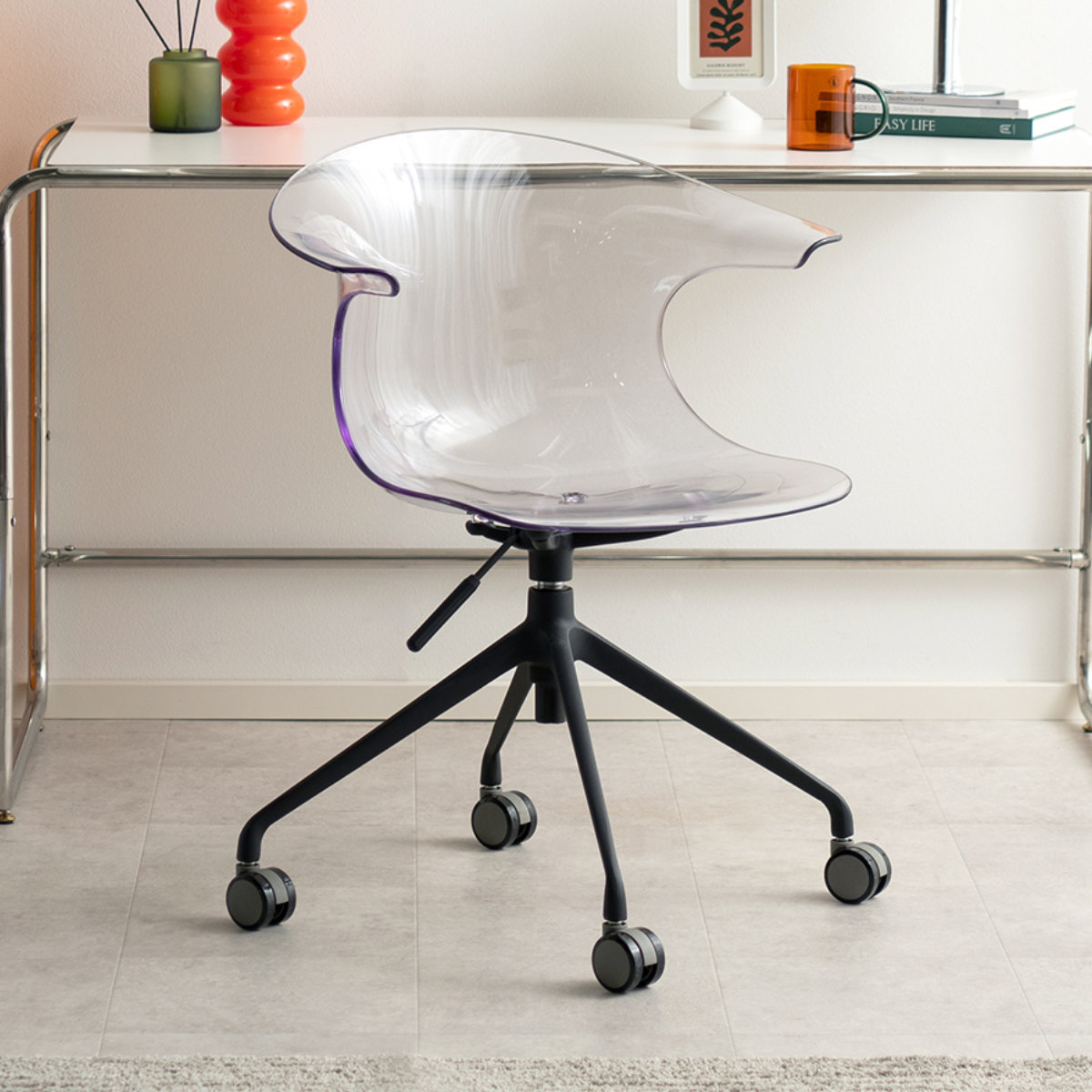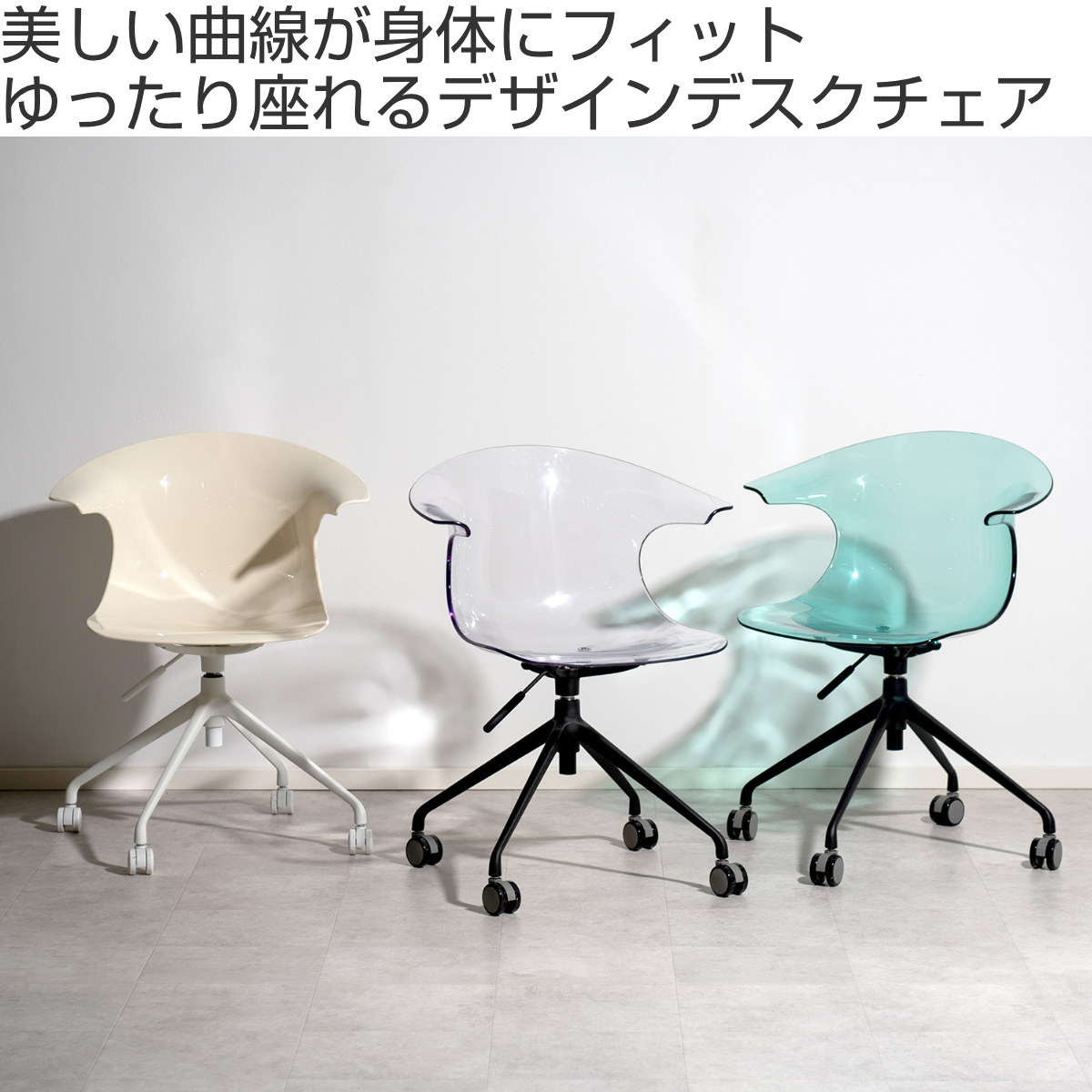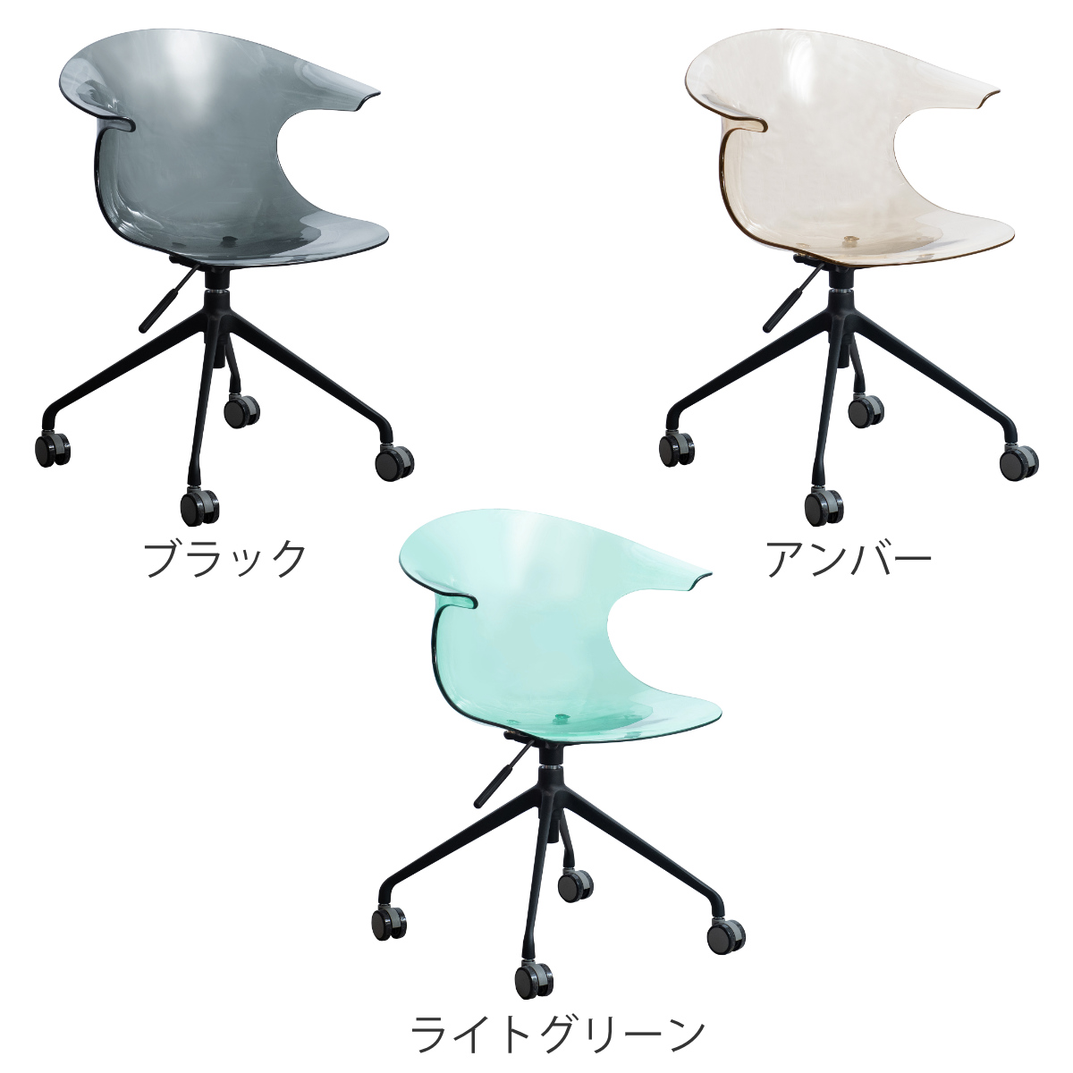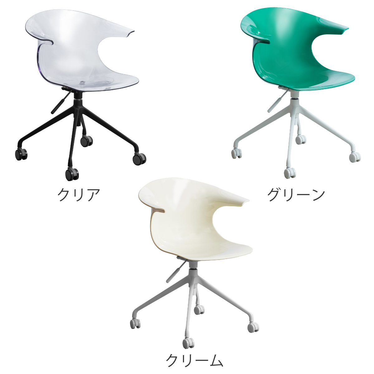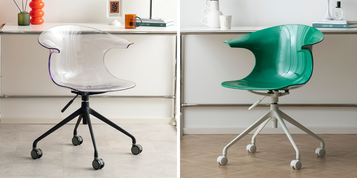 美しい曲線座面が身体にフィットするデザインチェア「Tois(トイス)」です。強度の高いポリカーボネート製の座面は背もたれ一体型で、ゆとりをもってお座りいただけます。不透明で白脚のクリーム、グリーン、透明で黒脚のクリア、ライトグリーン、アンバー、ブラックの6カラーからお選びいただけます。