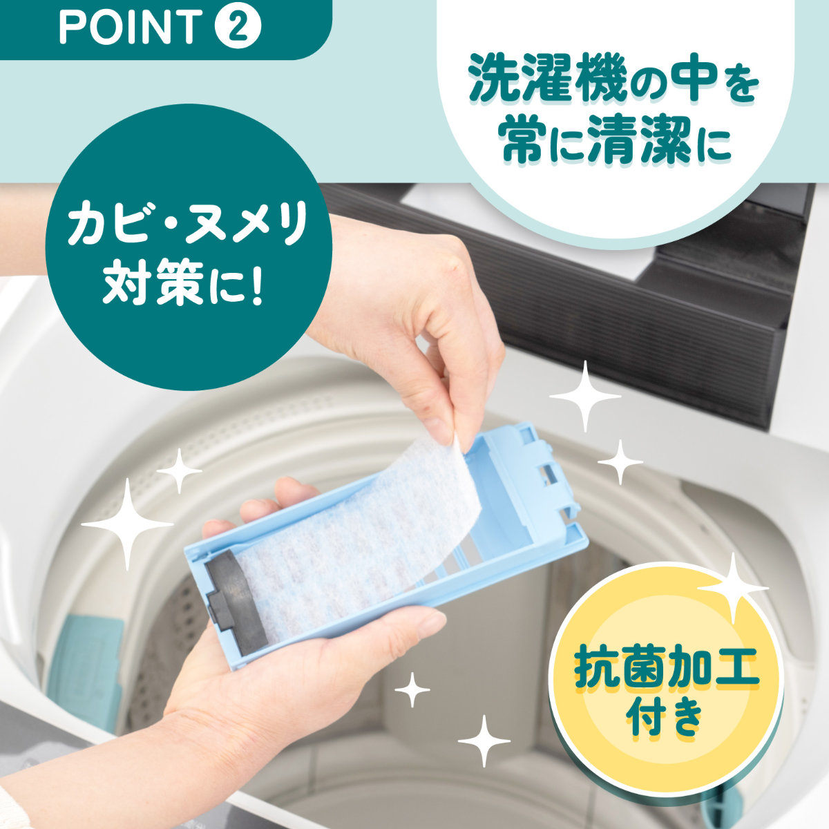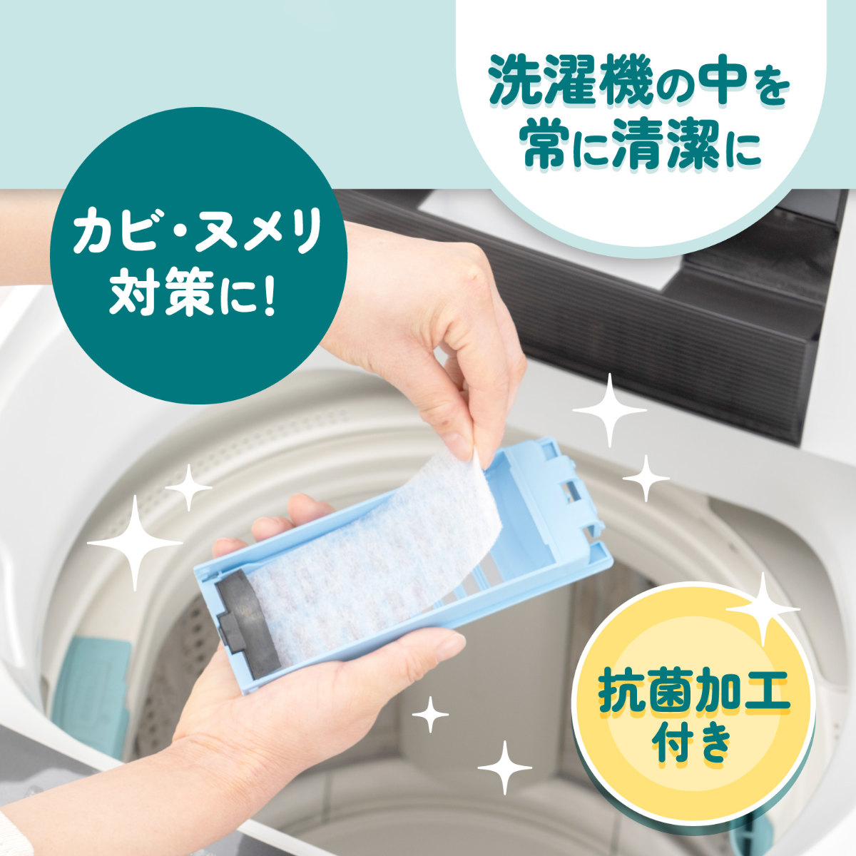 縦型洗濯機用「糸クズフィルター」です。洗濯機の糸クズフィルター本体に取り付けて、使用後はサッと外して捨てるだけで簡単にお手入れができます。掃除の手間を減らせます。