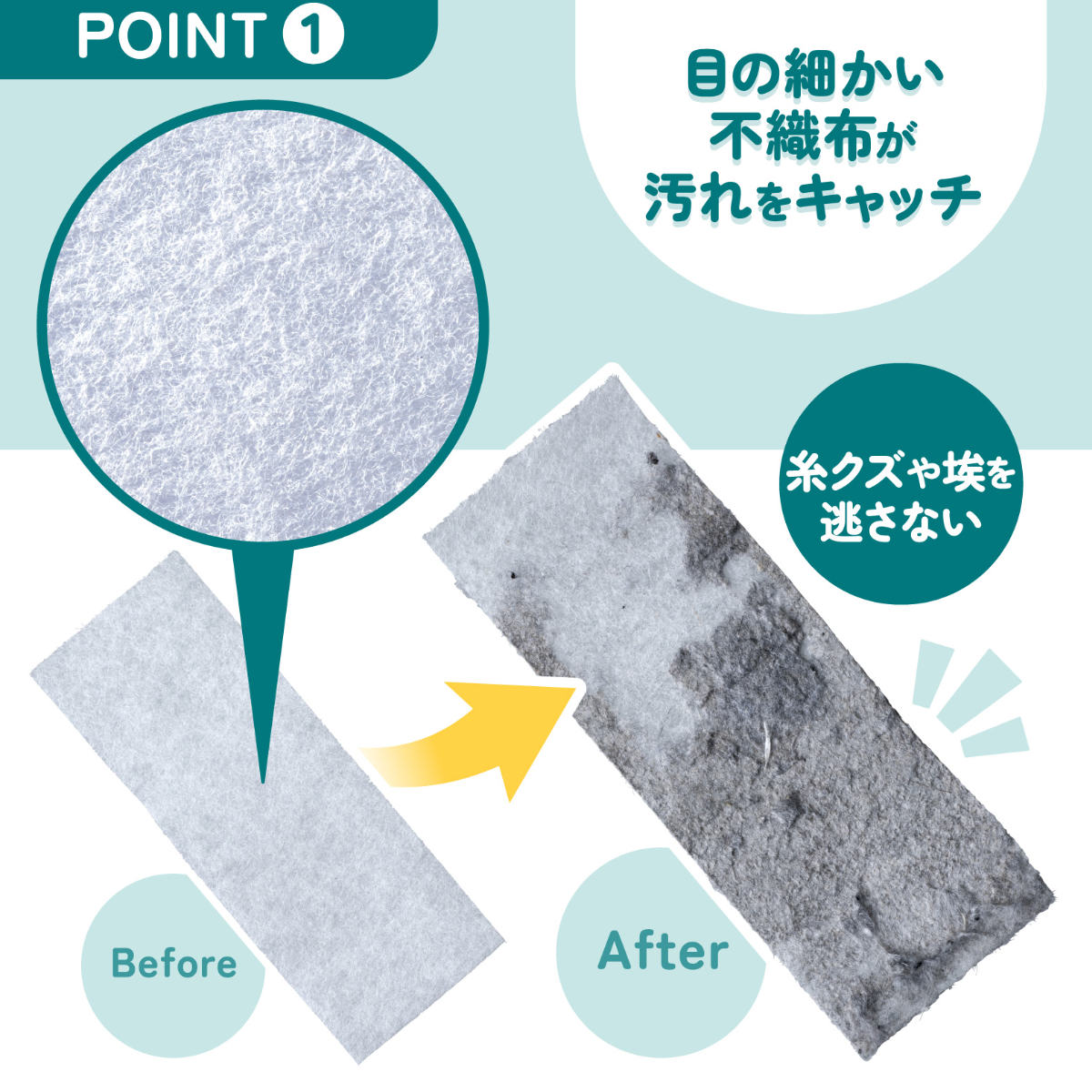 目の細かい不織布のフィルターが、糸クズや髪の毛をキャッチします。ほこりも逃しません。