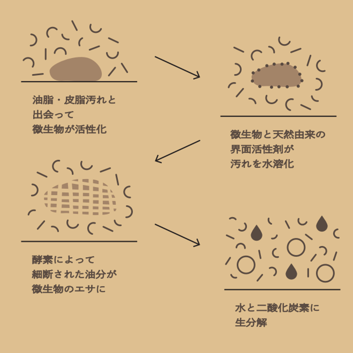 グッドバイオの汚れ落ちの秘密は、水質浄化や土壌改良にも役立つ常在菌「枯草菌」と、その補佐をする数百万種もの酵素です。油脂・皮脂などの汚れ成分に触れると、それらの成分パワーが覚醒。汚れを浮かせて細断し、水と二酸化炭素にまで分解します。