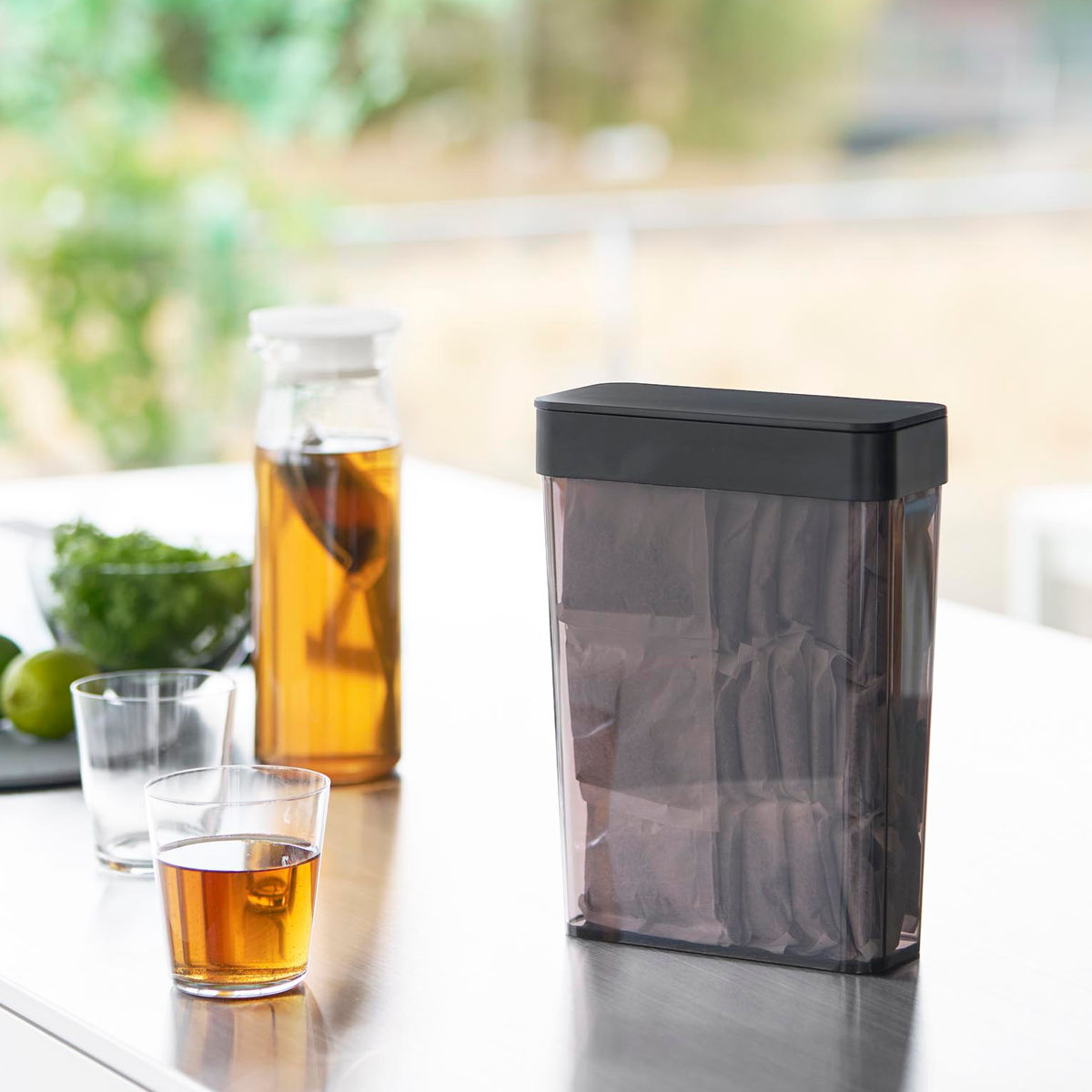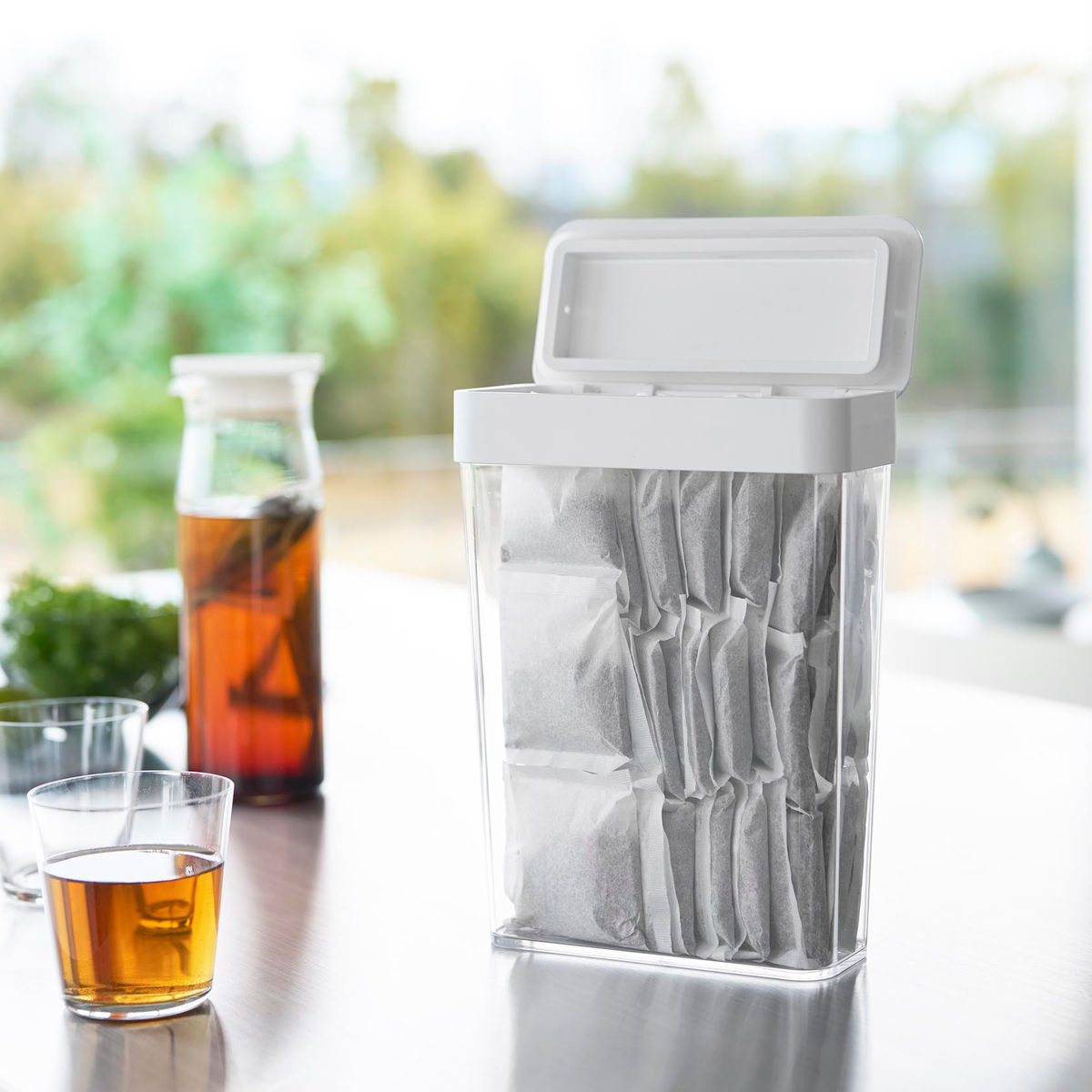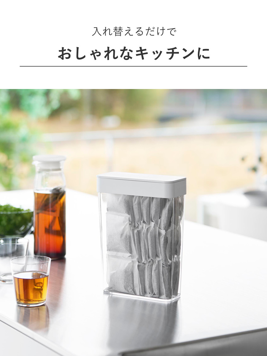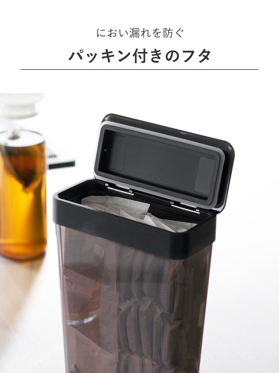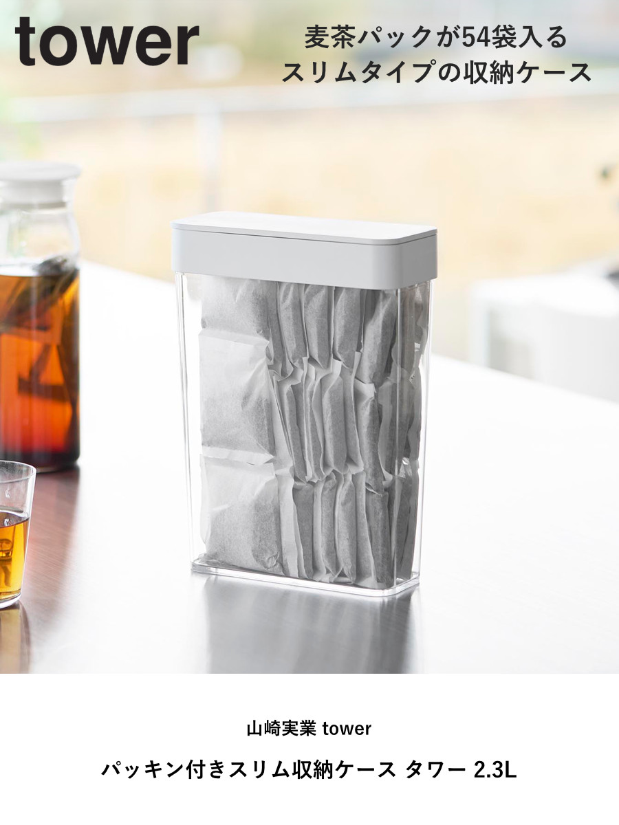 収納に困る麦茶パックが54袋入るスリムタイプの収納ケースです。パッキン付きのフタが、乾燥や湿気、におい漏れを防ぎながら保管できます。まとめて収納できるので、生活感を感じさせず見た目もスッキリします。
