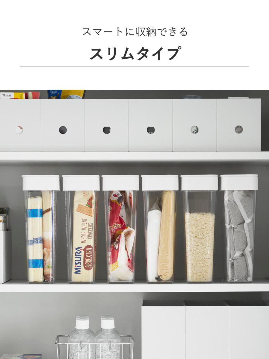 スリムな形状で食器棚やキッチンカウンターの限られた場所にもすっきり収納できます。複数揃えても透明だから中に何が入っているか一目で確認できて、迷わずサッと取り出すことができます。