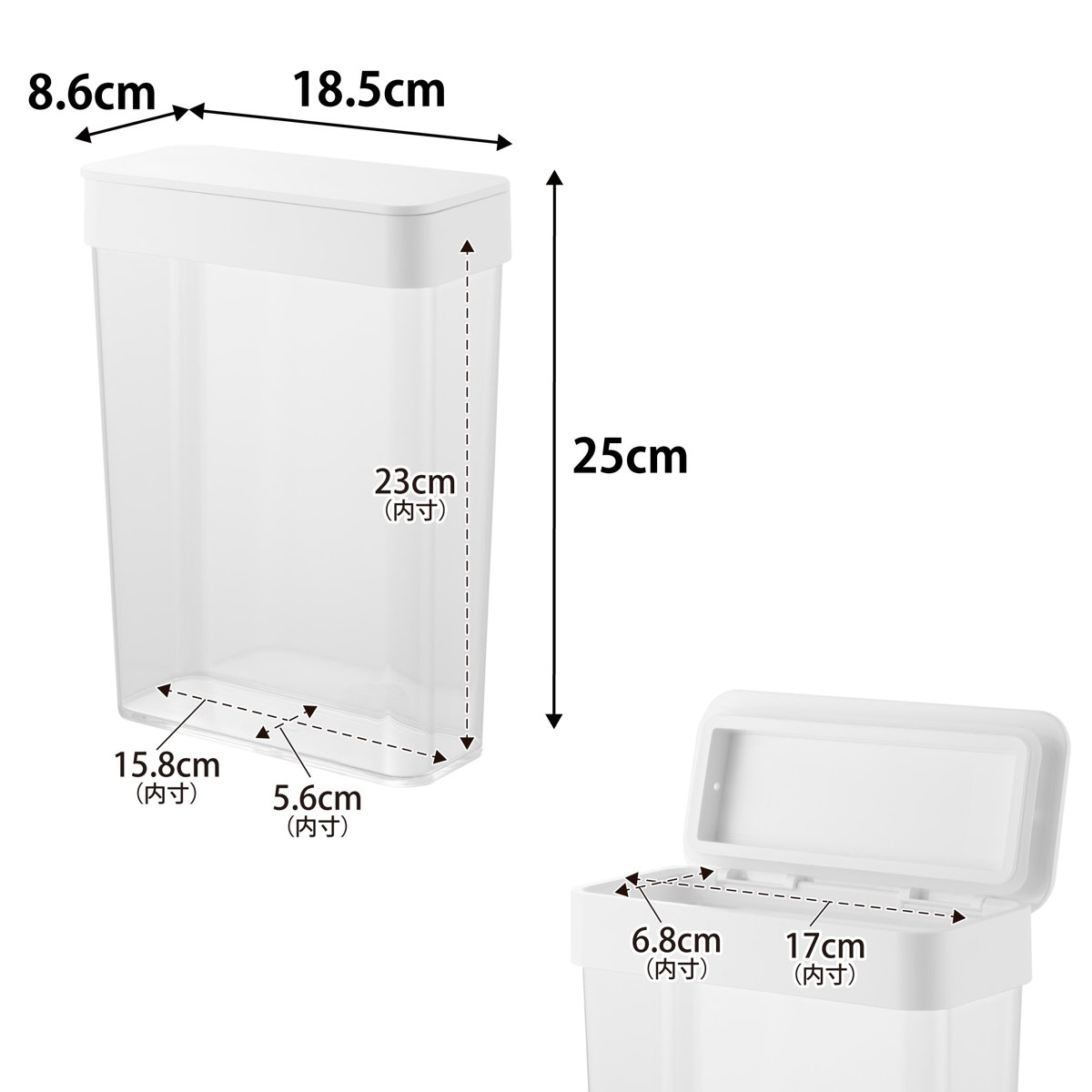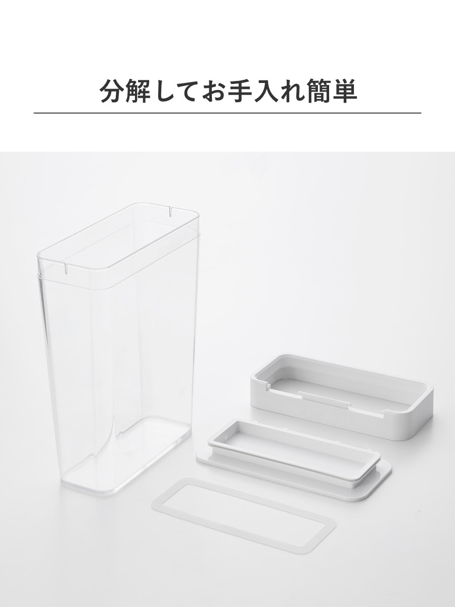 | サイズ | 約 幅18.5×奥行8.6×高さ25(cm) 【内寸】 容器:約 幅15.8×奥行5.6×高さ23(cm) 蓋開口部:約 幅17×奥行6.8(cm) |