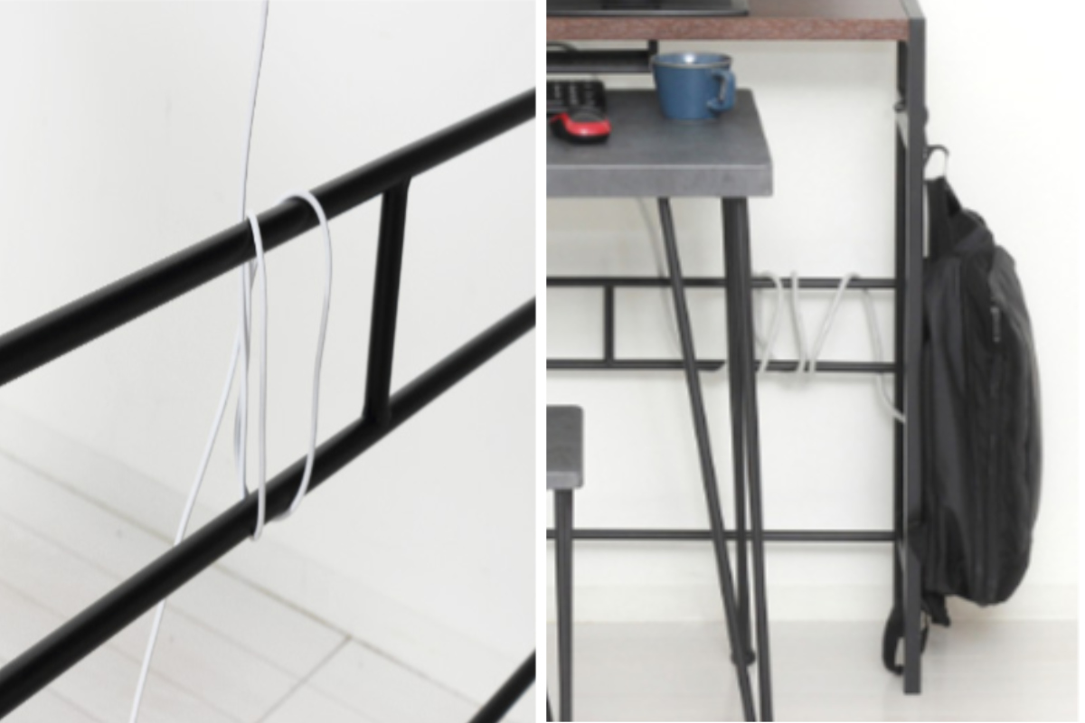 スチールフレーム脚は見た目がすっきりするだけでなく、マグネットやS字フックを取り付けたり、コードを巻きつけてまとめることもでき便利です。