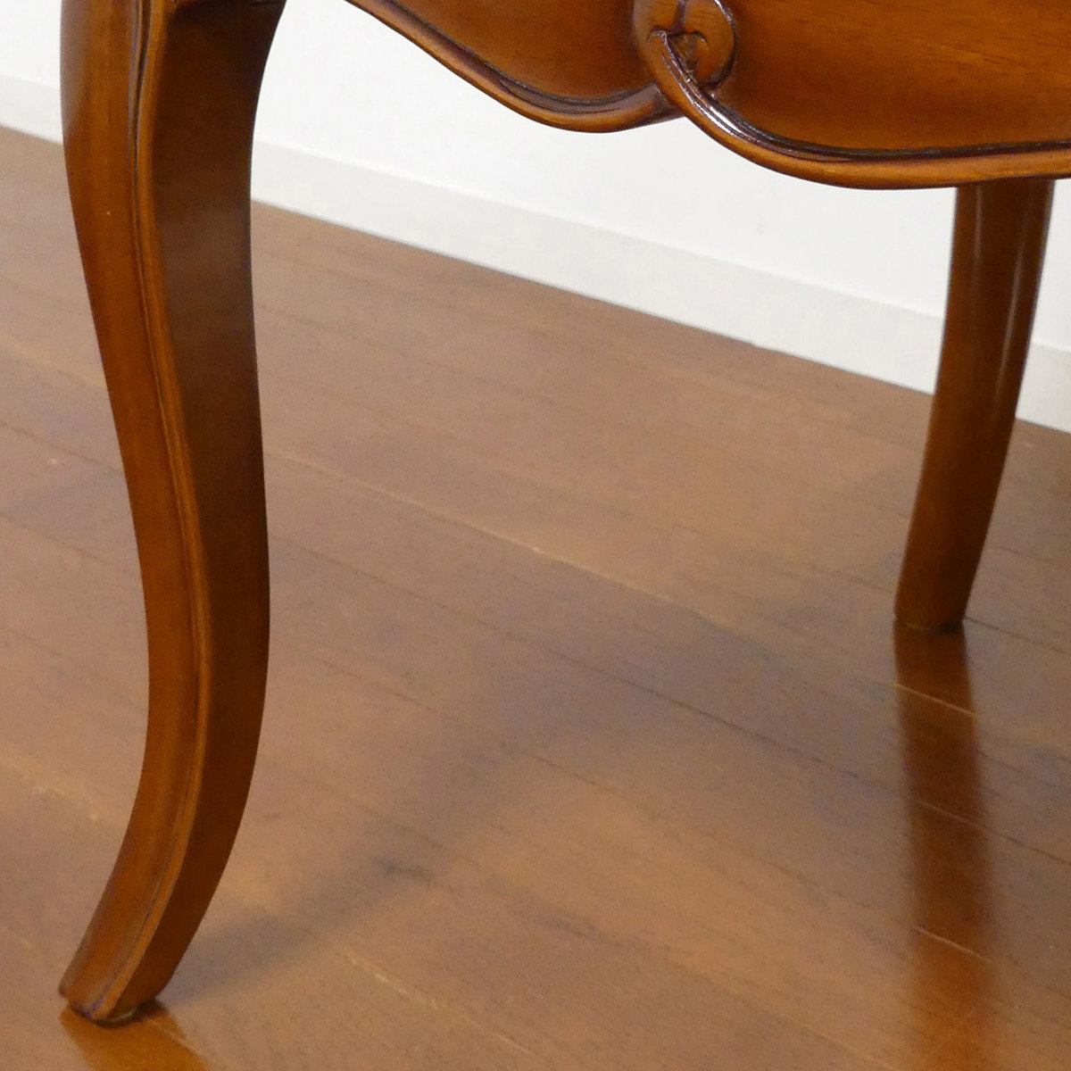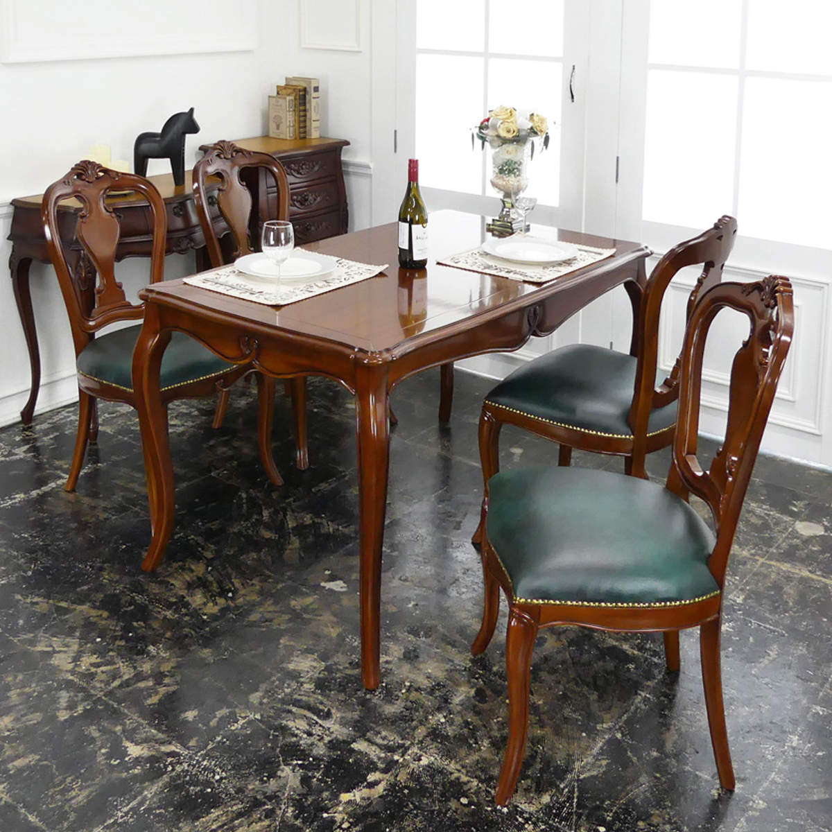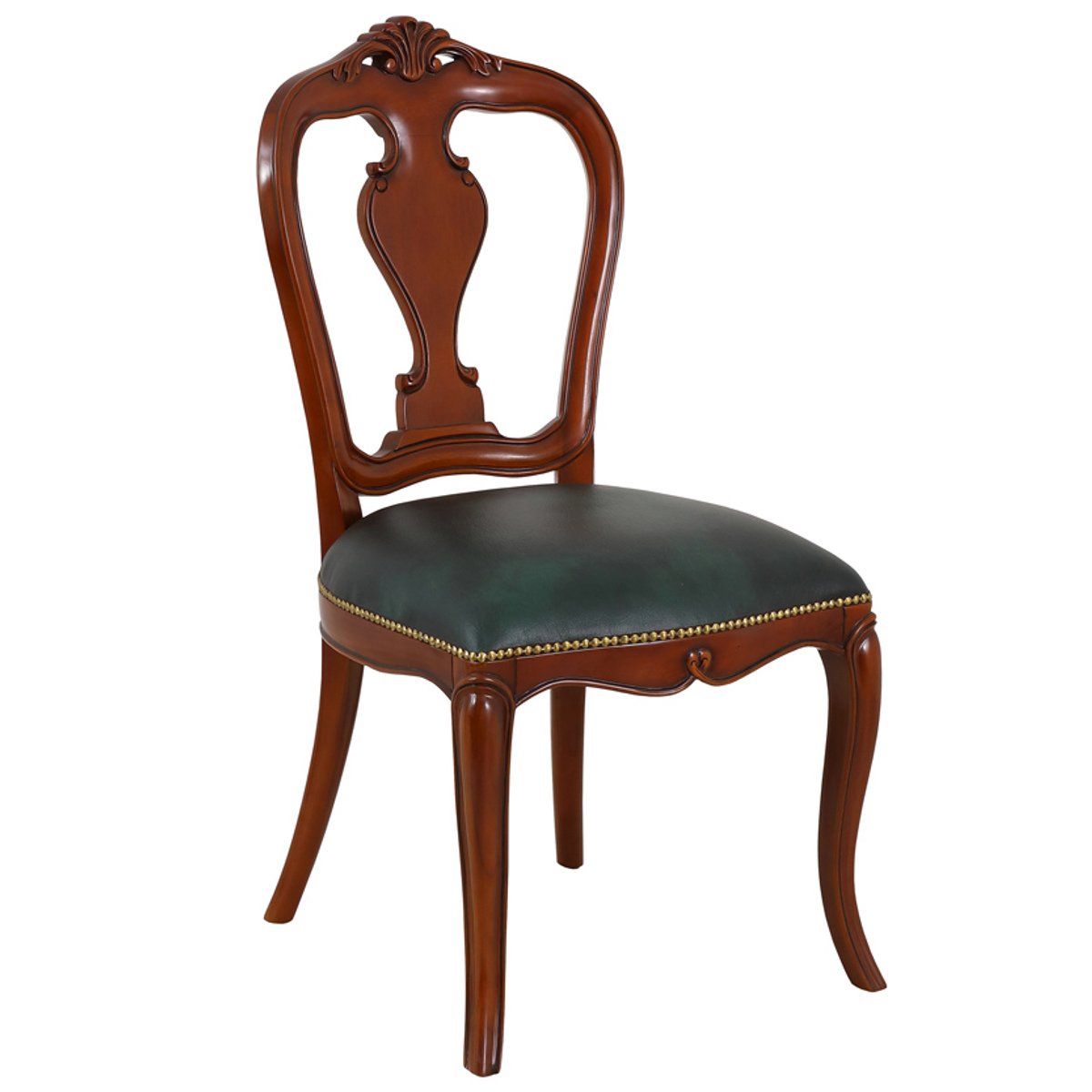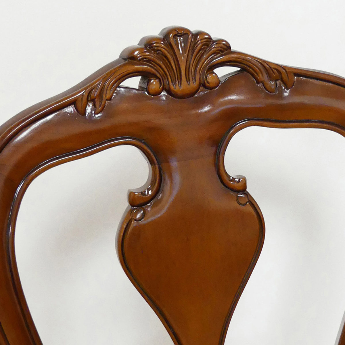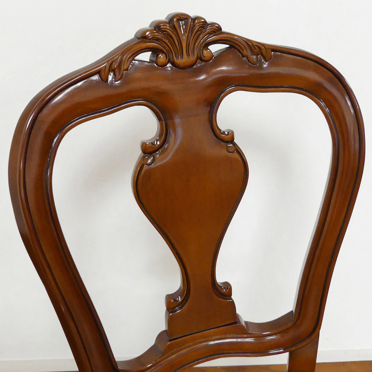 高級木材「マホガニー」を贅沢に使用し、熟練職人による繊細な手彫りで仕上げられた、優美なヨーロピアンスタイルのダイニングチェアです。クラシカルな曲線美と、気品漂うブラウンカラーが空間を上品に彩ります。