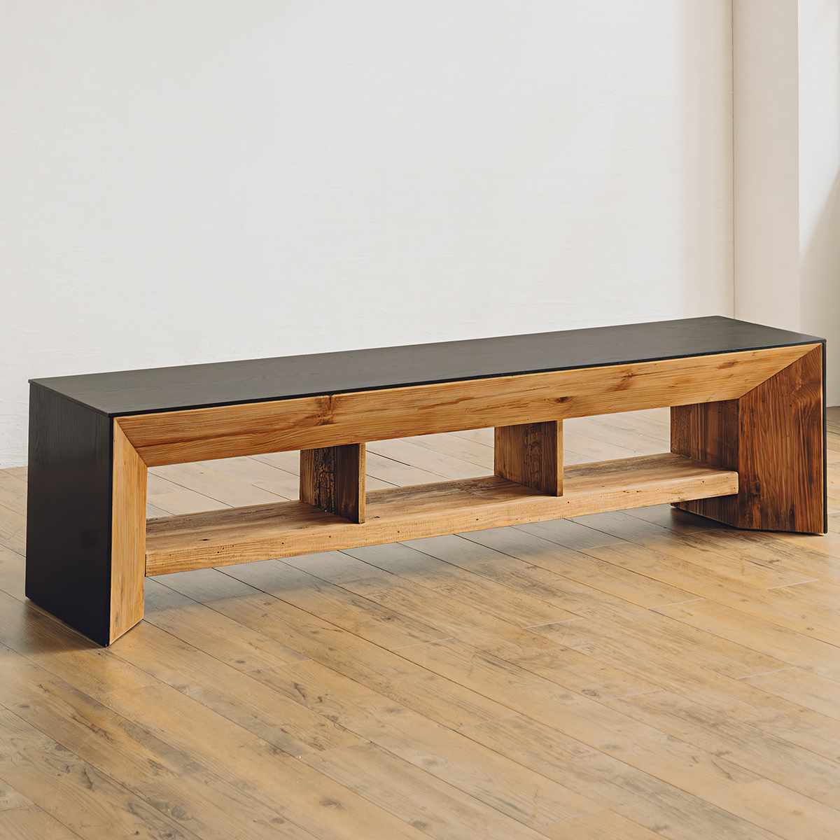 経年で深まる風合いが魅力のパイン古材を贅沢に使ったテレビ台です。木目や節のひとつひとつが個性となり、温かみと洗練されたヴィンテージ感を演出します。オープンタイプなので見せる収納も楽しめ、インテリアのアクセントとしても存在感を放ちます。