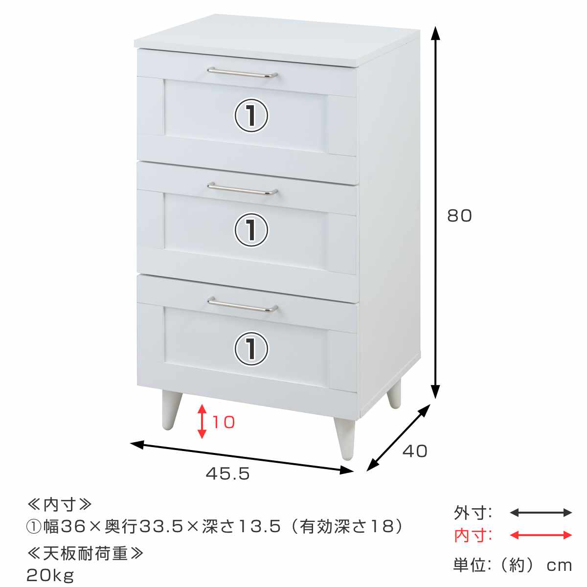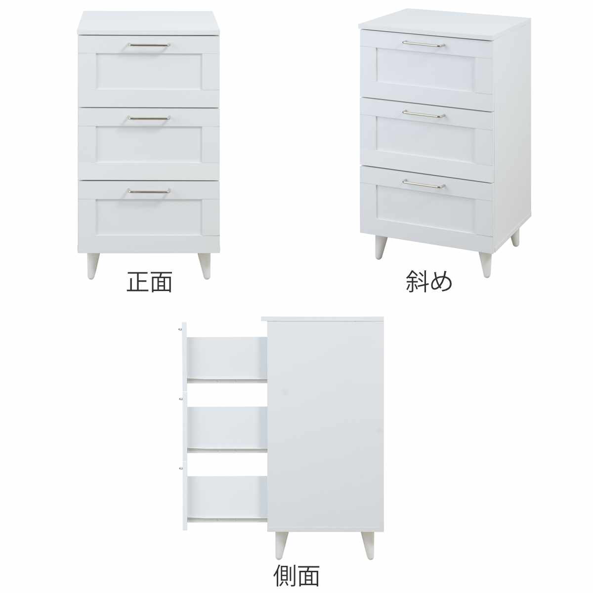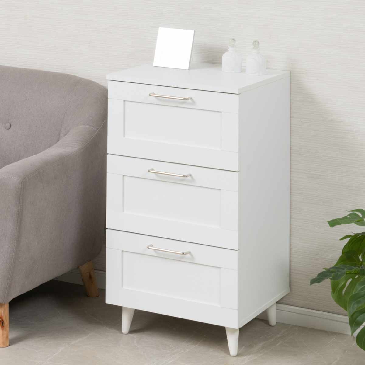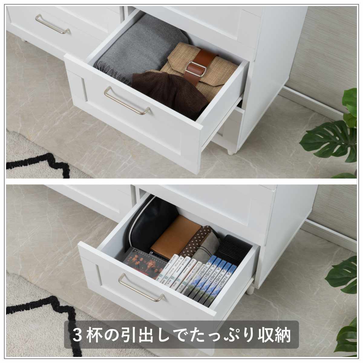 コンパクトなサイズ感ながら、3杯の引出しにしっかり収納できます。引出しは深さがあるので、厚手の衣類もきちんと収まります。リビングや寝室のサイドボードとしても使いやすいサイズです。
