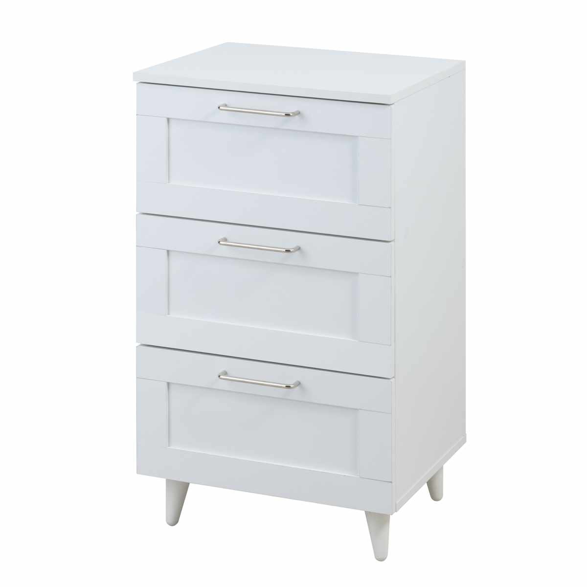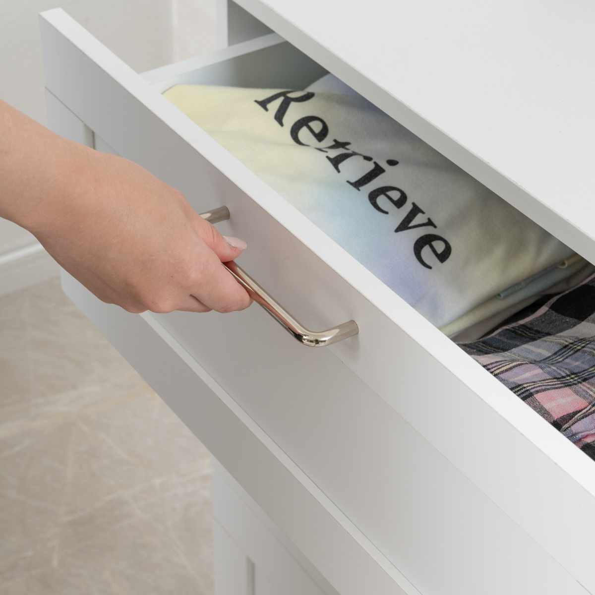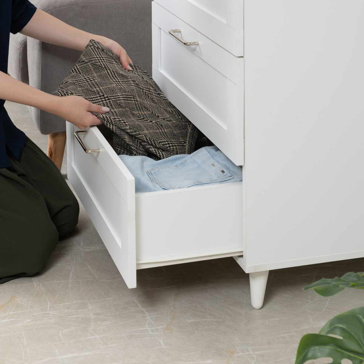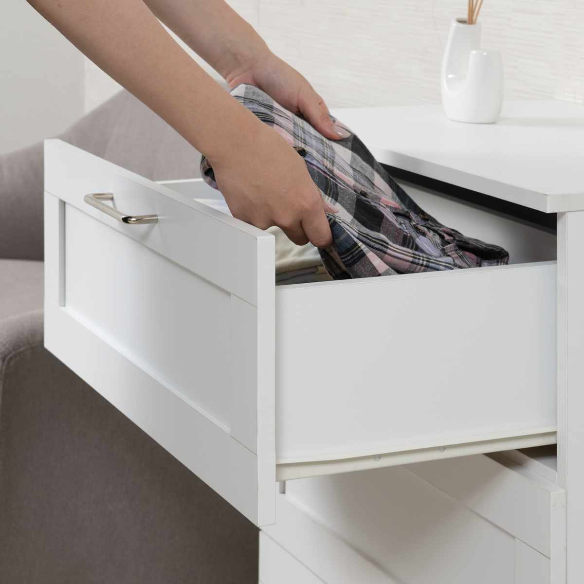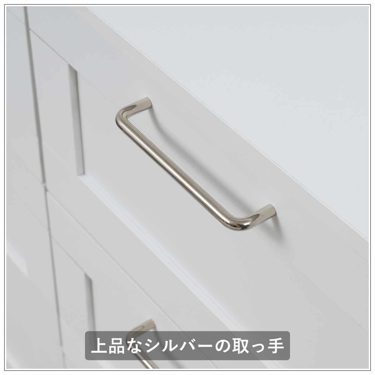 白を基調にしたチェストに、控えめなシルバーの取っ手がアクセントになり、上品な雰囲気を引き立てます。