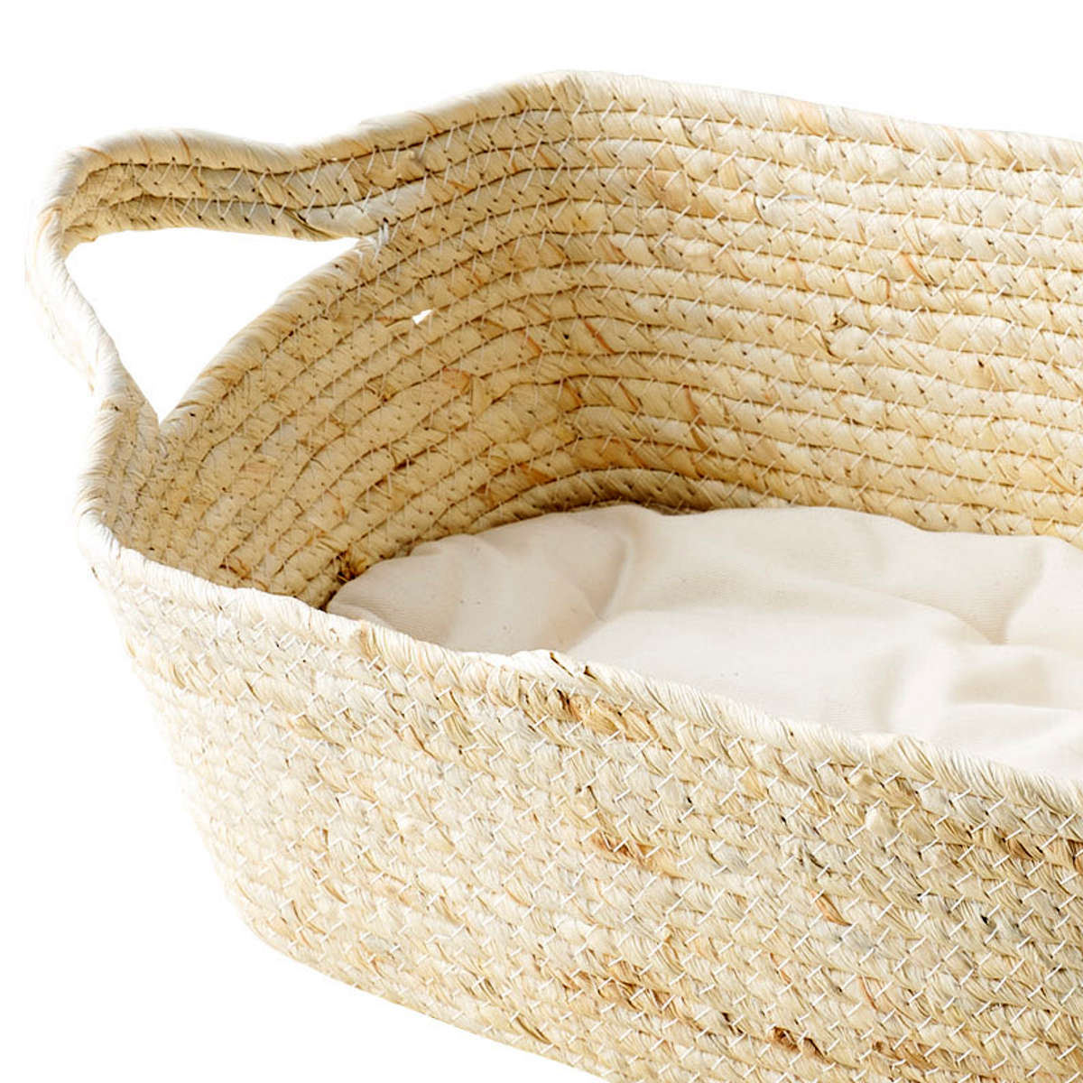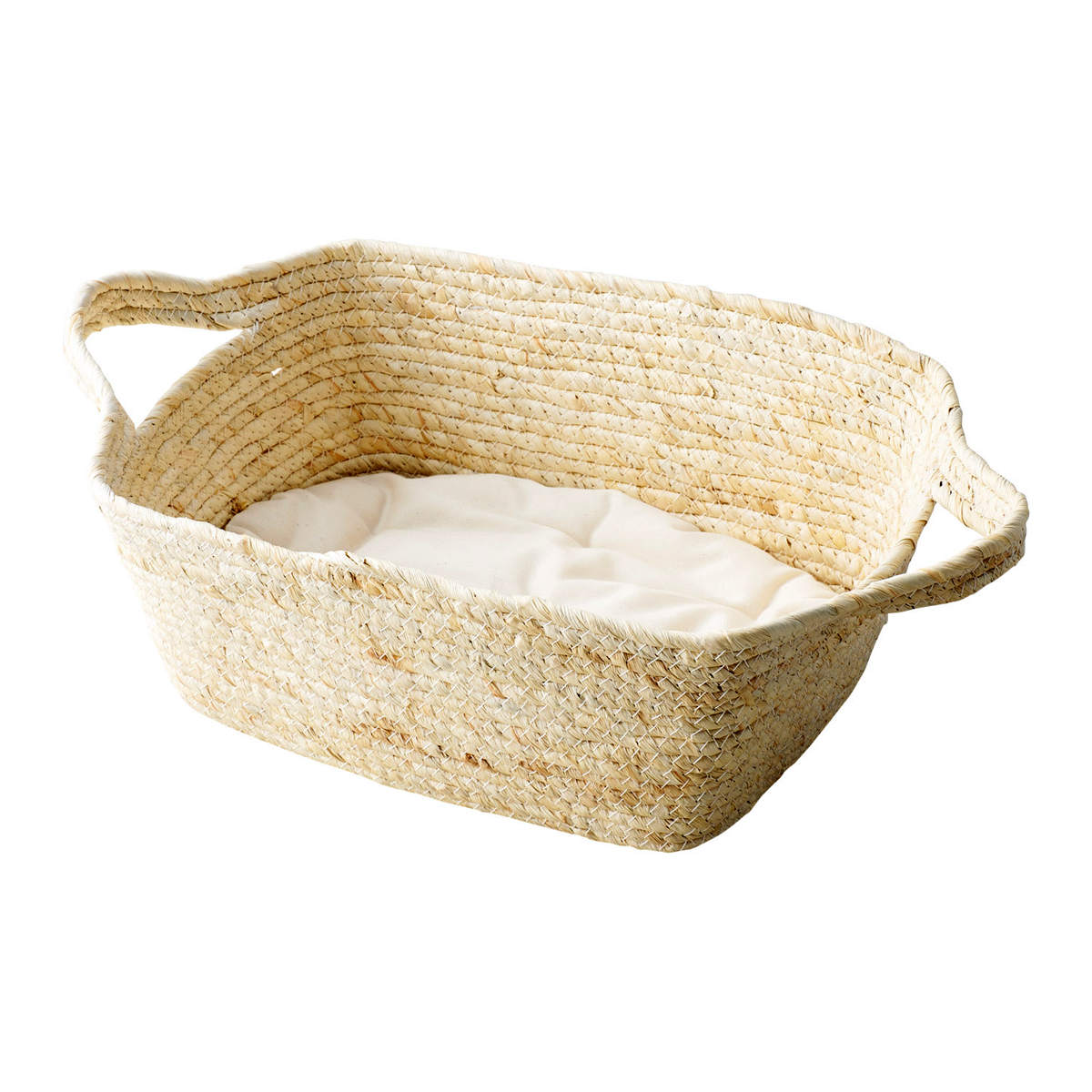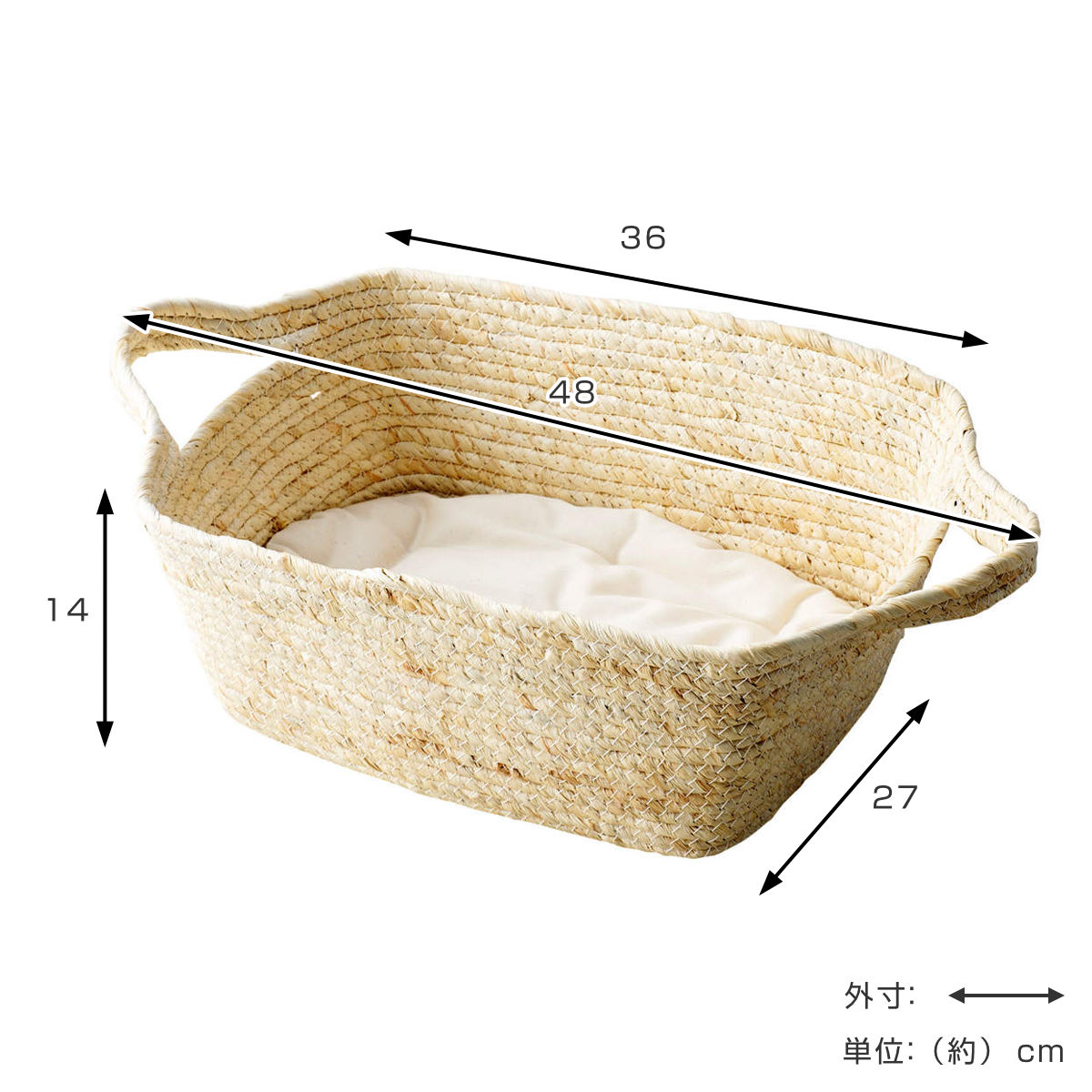 優しい風合いのペット用バスケットです。国産のクッション付きで安心してくつろげ、わんちゃんやネコちゃんが本能的に落ち着く居場所になります。ウサギなどの小動物にもお使いいただけます。