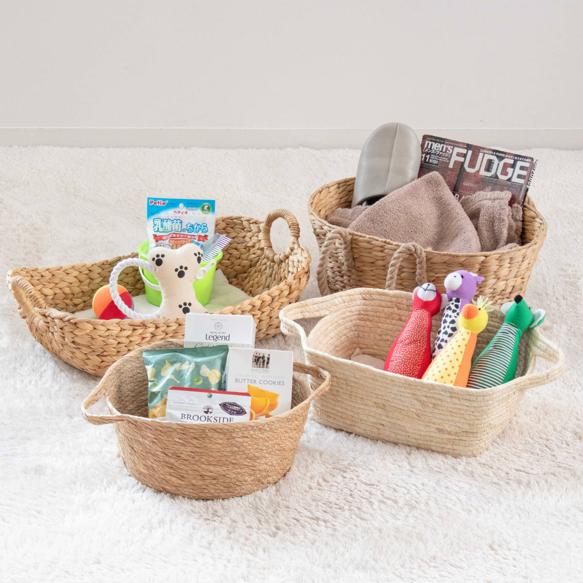 わんちゃんのオモチャ入れとしてはもちろん、タオルなどを収納するバスケットにしたり、アイデア次第でいろいろな使い方ができます。テーブルや床に置いた際に、傷つける心配がなく、家中どこでも安心してご使用いただけます。