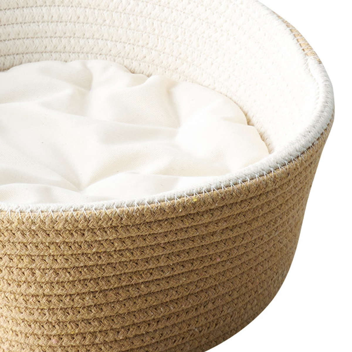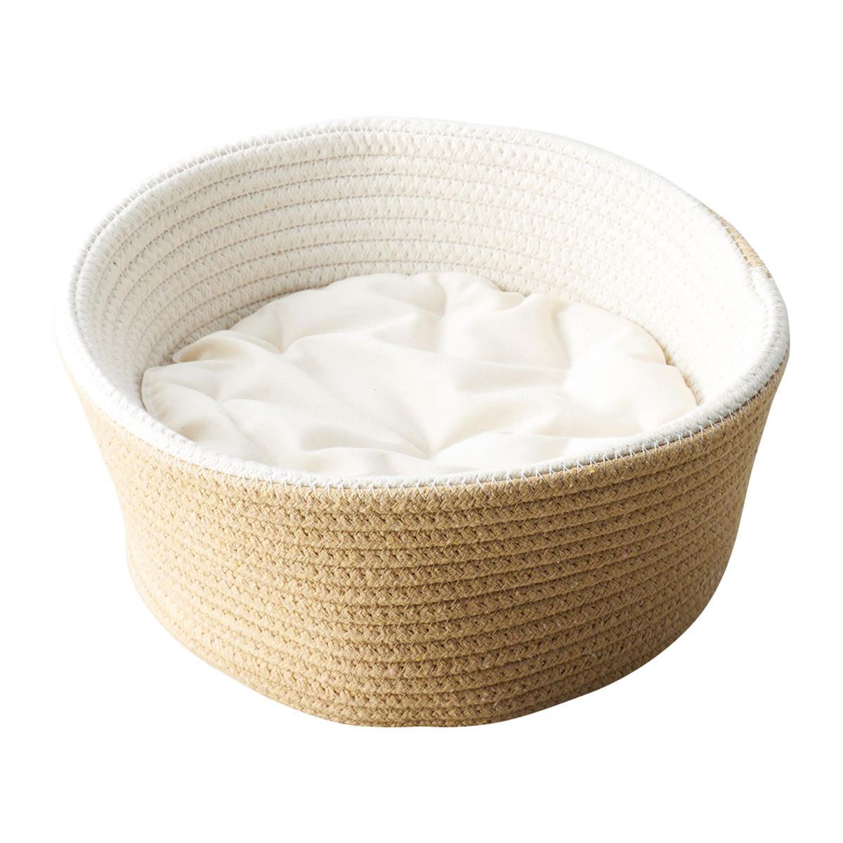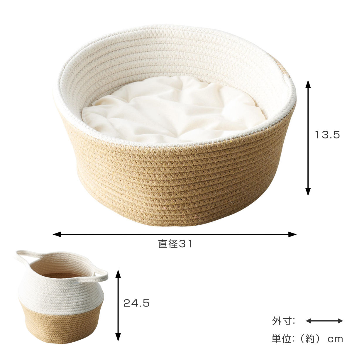 柔らか素材のロープで編まれたペット用バスケットです。国産のクッション付きで安心してくつろげ、わんちゃんやネコちゃんが本能的に落ち着く居場所になります。ウサギなどの小動物にもお使いいただけます。
