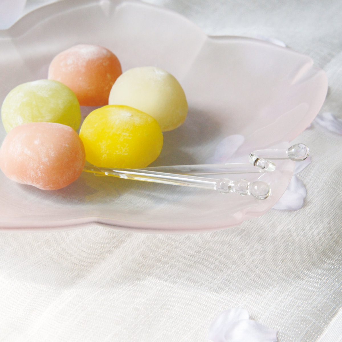 ケーキや和菓子、フルーツの盛り付けにも最適です。おかずの盛り合わせやサラダを少量盛るのにも使え、食卓にやさしい彩りを添えます。透明感のあるガラスと淡い桃色が、料理の色彩をより一層美しく演出します。