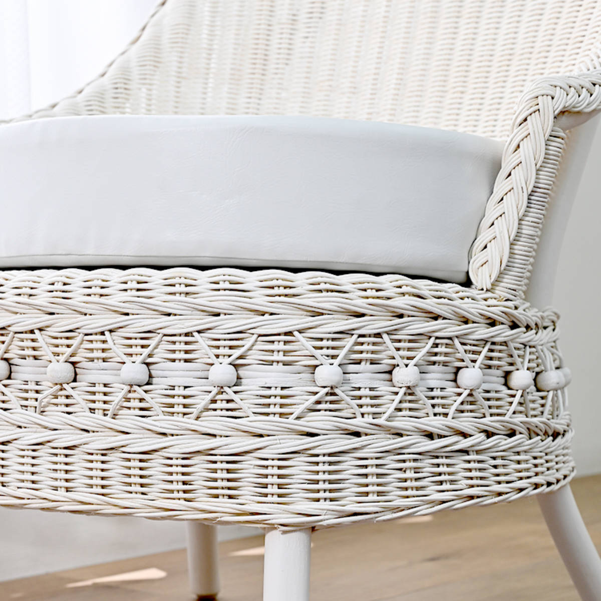 ホワイトウォッシュカラーに染めたラタンを丁寧に編みこんだ、贅沢なつくりのチェアです。ラタン製なので、軽くて持ち運びしやすい点も嬉しいポイントです。リビングはもちろん、ドレッサーでちょっと座るのにも便利で、インテリアとして置くだけでも心ときめくデザインです。