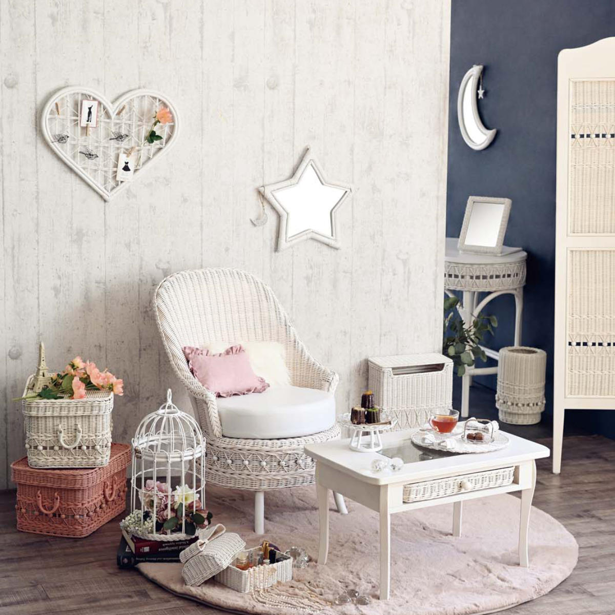 チェアの全面にしなやかで丈夫なラタンを贅沢に使用しています。リボンをモチーフにした愛らしい編みデザインが、お部屋をより一層華やかに。