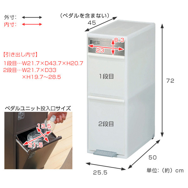 | 材質 | 本体・引出し・天板:ポリプロピレン ペダルパーツ:ABS樹脂 パネル・シャフト:ステンレス(SUS304) |