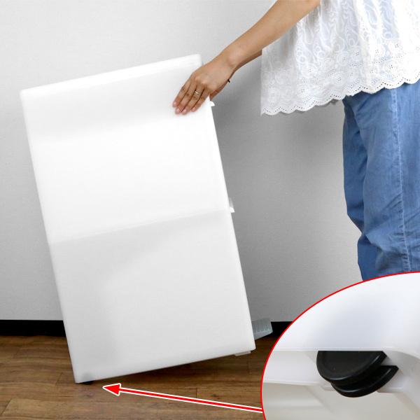 スイング蓋をプッシュすれば、片手でゴミを捨てることができます。下段のペダルユニットは大きく開くので、かさばるペットボトルやプラスチックゴミなどの分別におすすめです。後方のみキャスターが付いています。手前を少し浮かせれば、スムーズに移動させることができます。