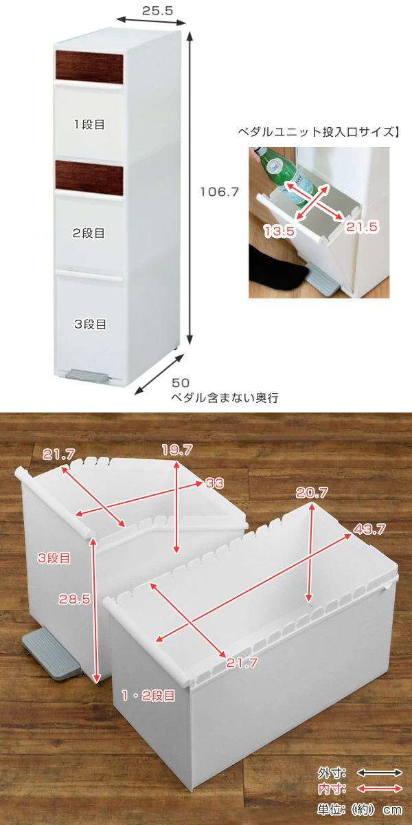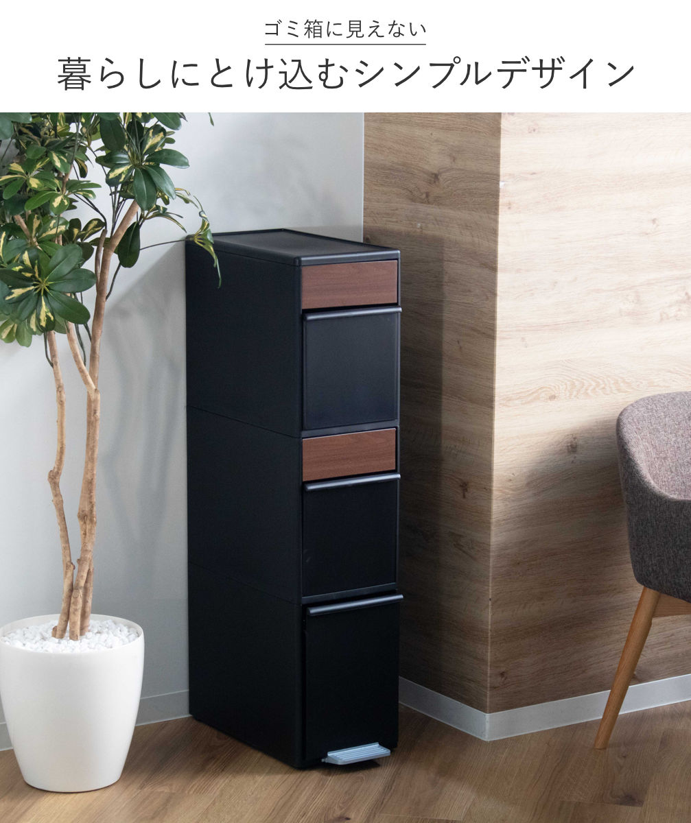 キッチンの空間を有効に使える、幅約25.5cmのスリムなゴミ箱です。冷蔵庫・シンク・食器棚横などのキッチンのデッドスペースに設置できて、ペットボトル・缶などのかさばる資源ゴミもひとまとめにできます。