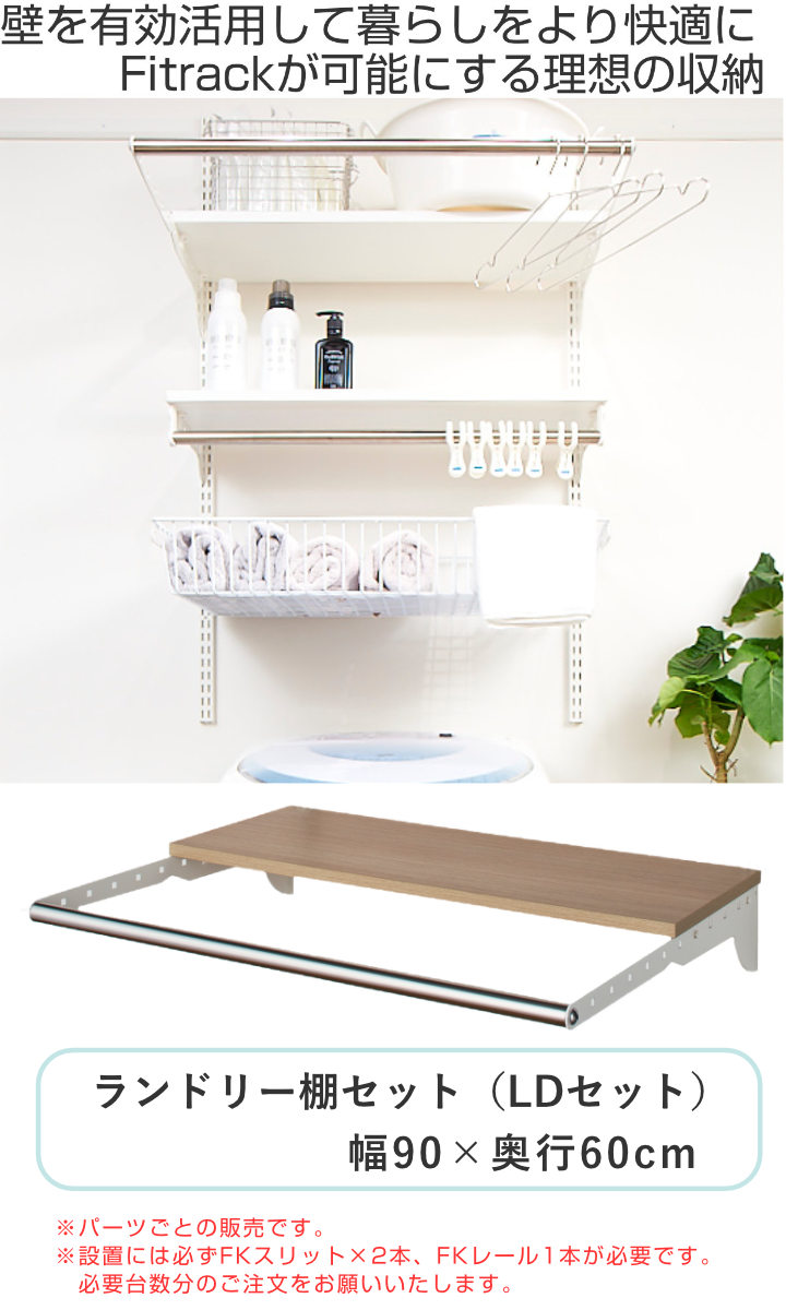フィットラックは別売りのFKレール(横棒)とFKスリット(縦棒)の両方を壁に設置して、FKスリットにパーツを取り付けます。パーツとなるランドリー棚の幅は【45・60・75・90cm】の4種類で、収納スペースに合わせて選べます。高さは2.5cm間隔でレールに掛けられるので、収納物や収納場所に合わせて調整していただけます。取り付けたい場所に窓があっても、気にせず設置ができます。