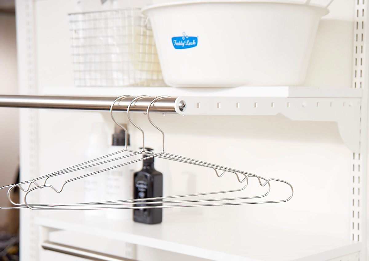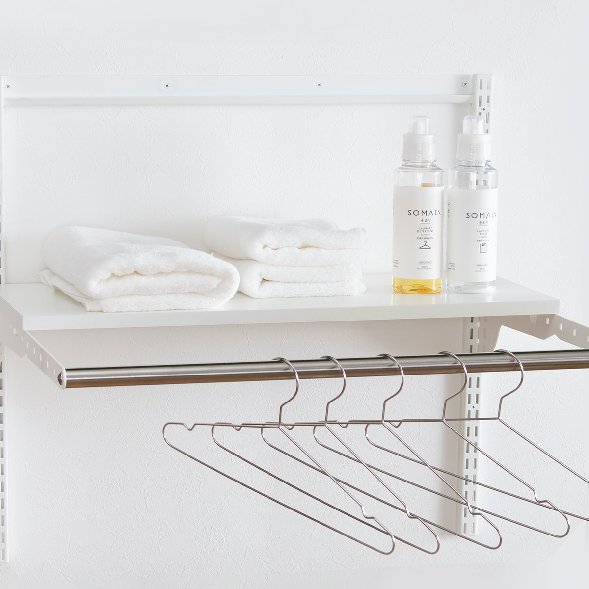 棚の手前にパイプが付いた「置く収納」「掛ける収納」が1つで2役可能なパーツ【ランドリー棚セット(LDセット)】です。棚には洗剤類や小物を、パイプにはハンガーやタオルを掛けられるのでランドリー収納にぴったりです。