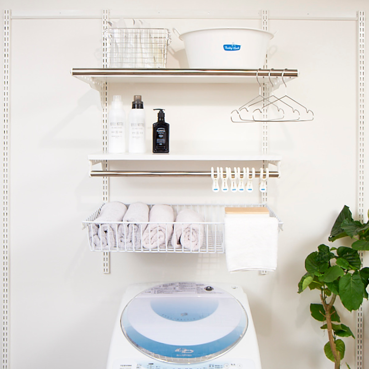洗濯機上に設置することで、洗濯する・干す・収納する洗濯動線に無駄ができず、毎日の洗濯もはかどります。洗濯物を干したり、棚に洗剤やタオルのストックを置いたり、限られたスペースを最大限に活かせます。