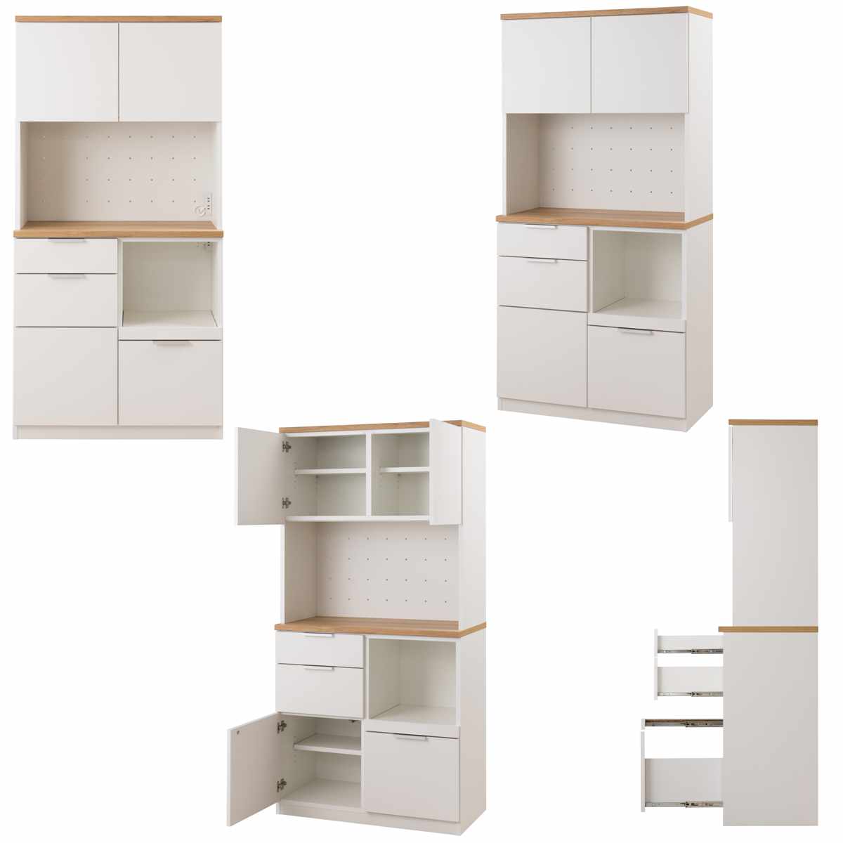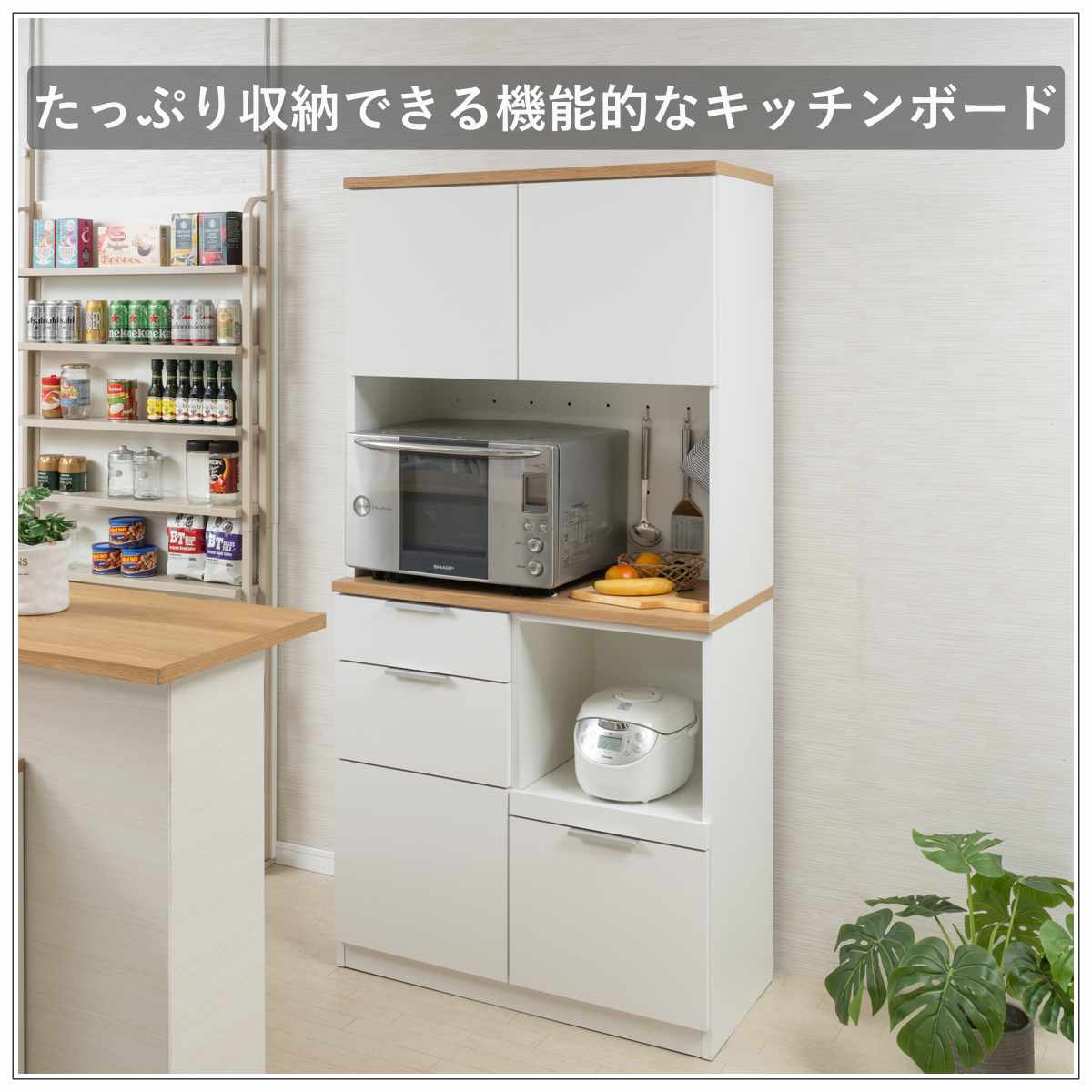 ホワイトと木目調の組み合わせがやさしい印象を与える、上品なキッチンボードです。シンプルながらも洗練されたデザインで、キッチンを明るく爽やかな空間に演出。食器や調理器具、家電などをすっきり収納でき、見た目と機能を両立した一台です。
