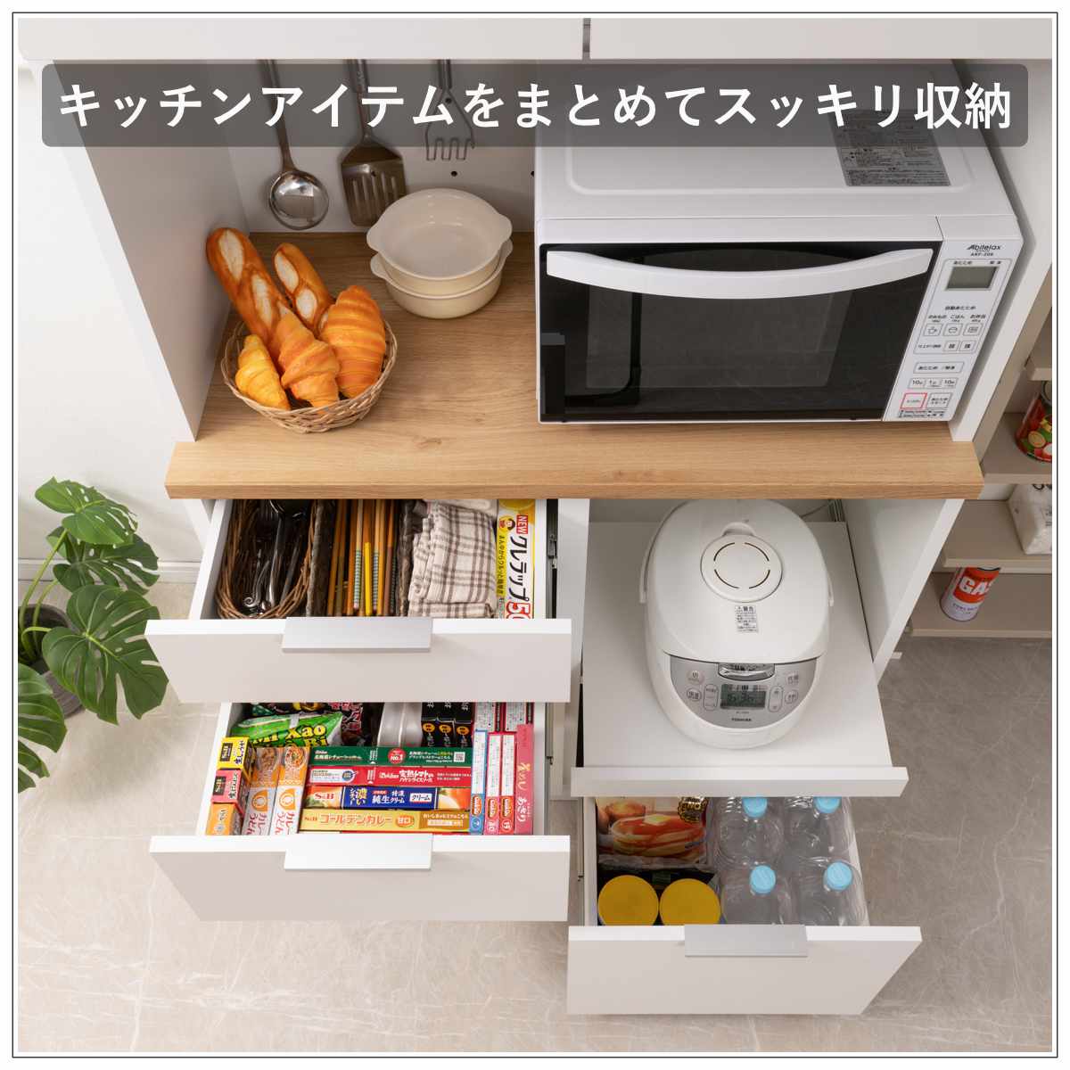 沢山のキッチンアイテムが、 この1台ですっきり収納できます。 食器類や家電製品にキッチン小物食品ストックもまとめて大量収納ができるのが魅力。機能や収納も日本製ならではの考えて造られた高品質のキッチンボードです。