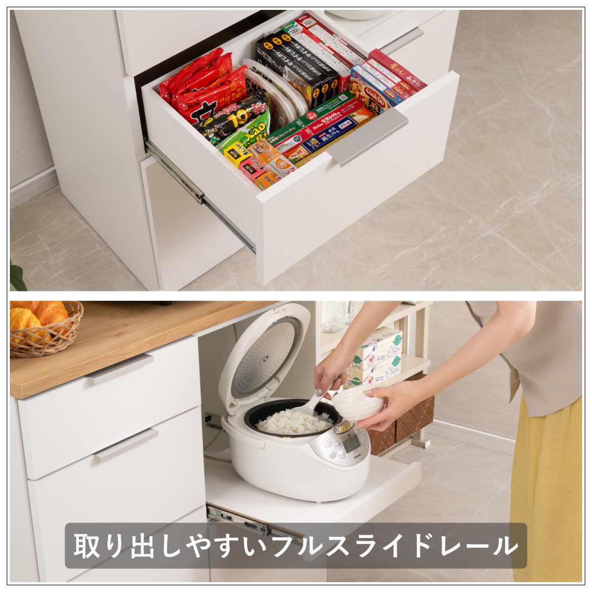 引出しは全段フルスライドレールを採用。奥の物まで見やすく出し入れがしやすいです。スライドレールも最後まで引き出せるので炊飯器のふたもしっかりと開きます。