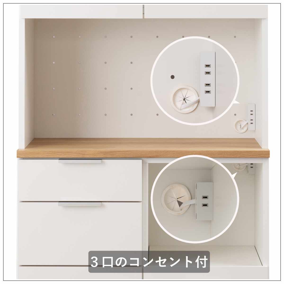 上段に2口、下段に1口の合計3口のコンセント付き。電子レンジや炊飯器、ポットなど複数の家電を同時に使えて便利です。