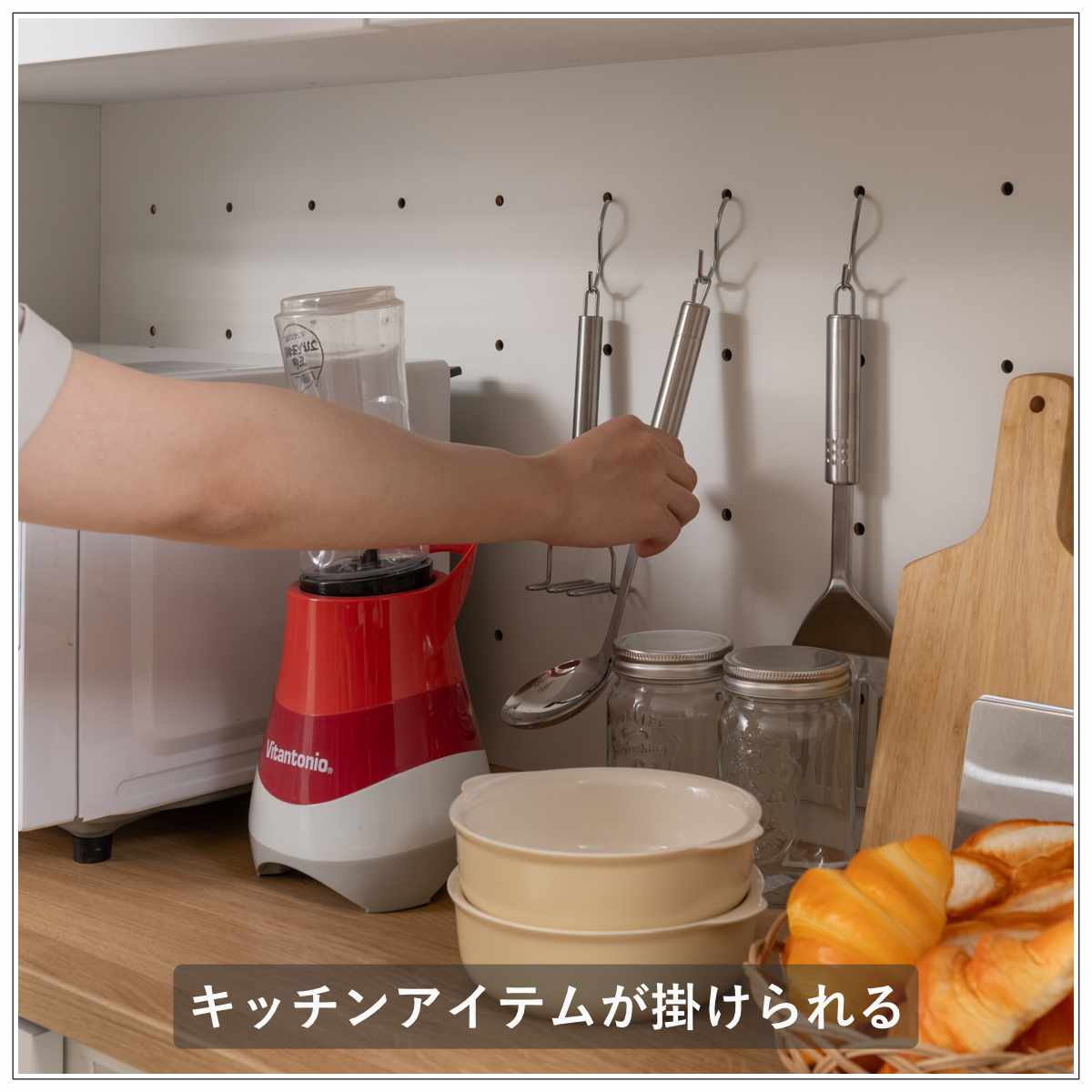 オープン部の背面にはキッチンアイテムを掛けられる穴が開いています。市販のS字フックなどを使って色々な物を掛けることができます。