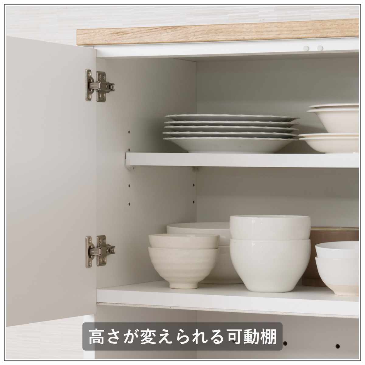 上部の扉内は左右に棚板が各1枚ずつあり、高さを3cm間隔で5段階変えることができます。グラスやお皿、保存容器など、収納する物のサイズに合わせてスッキリと整理可能です。