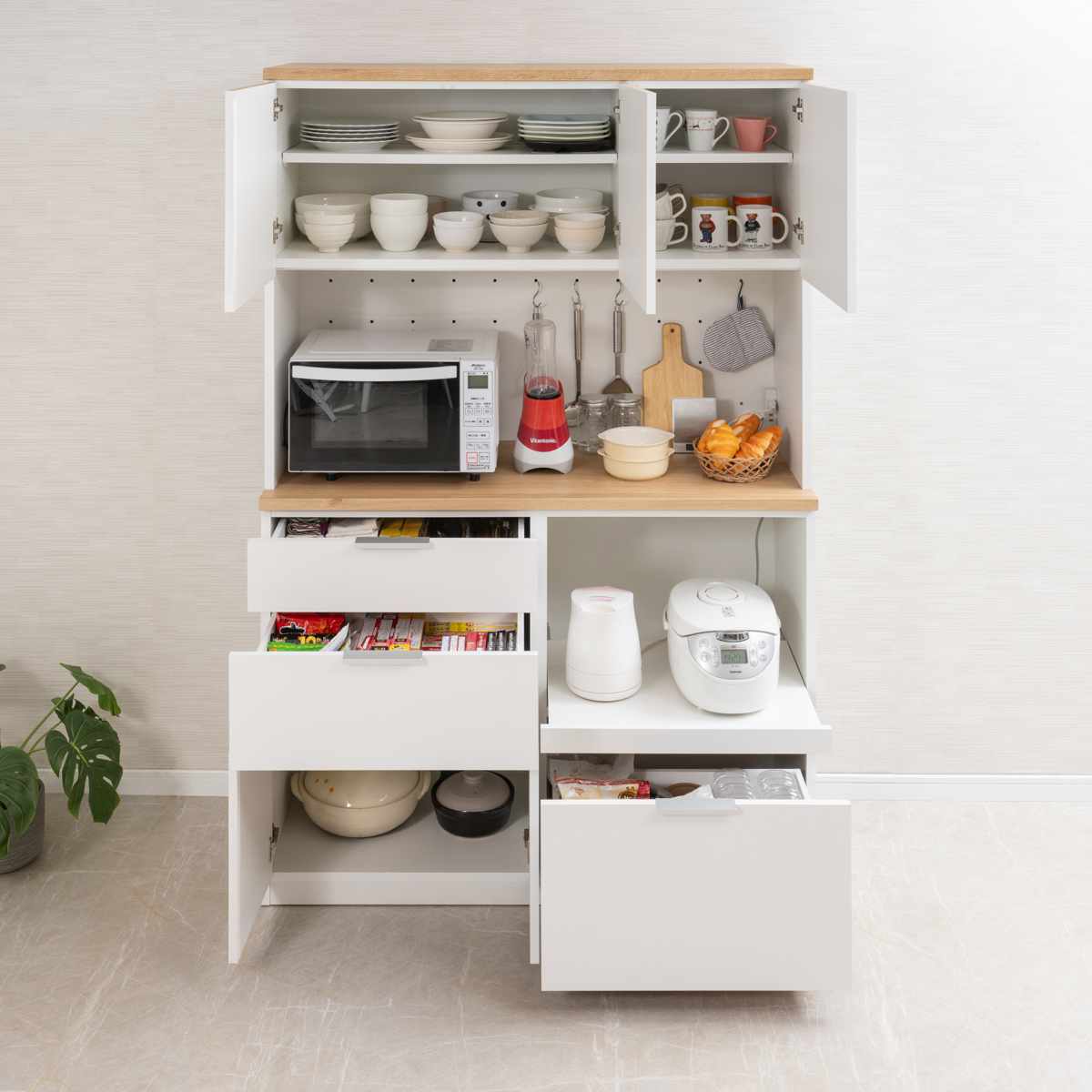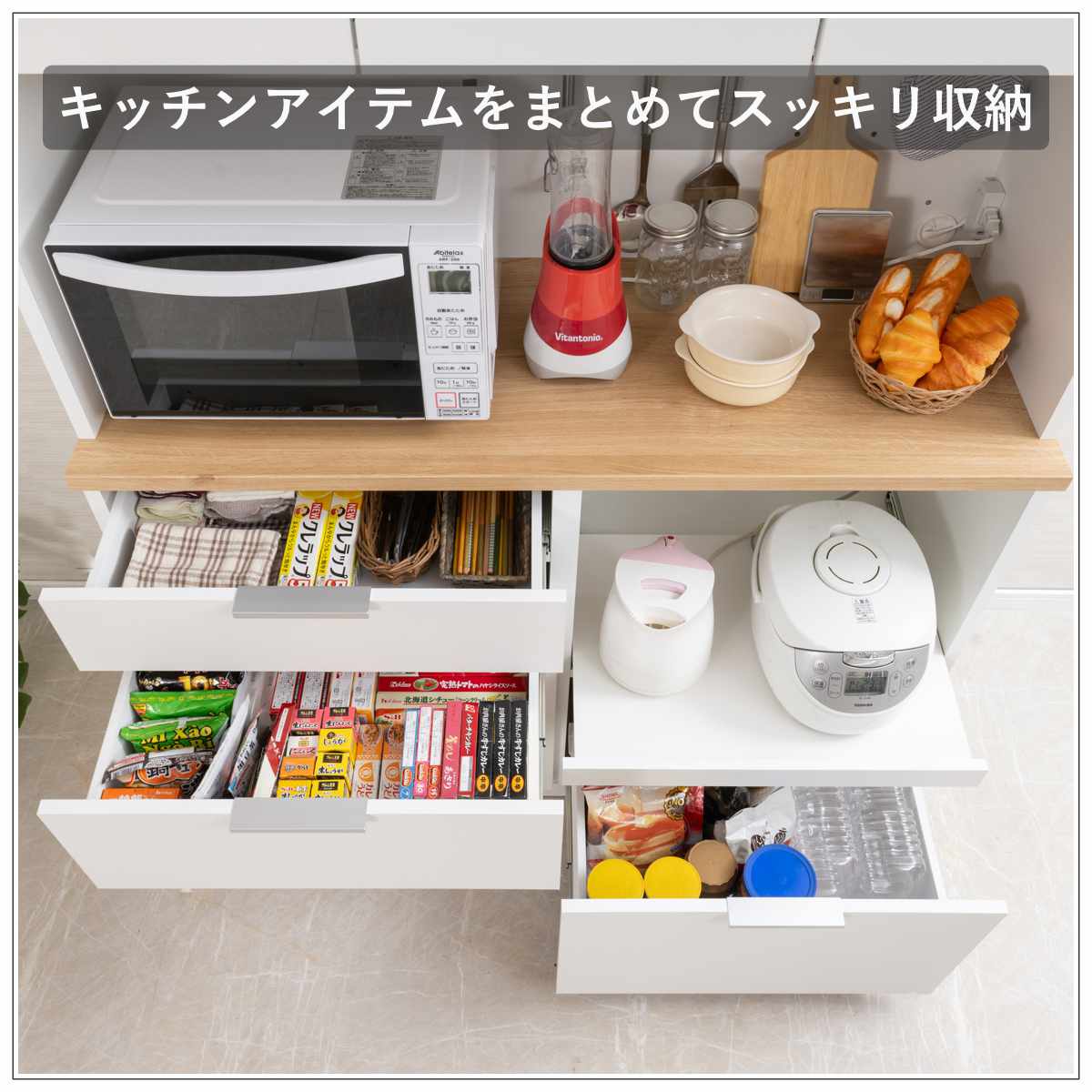 沢山のキッチンアイテムが、 この1台ですっきり収納できます。 食器類や家電製品にキッチン小物食品ストックもまとめて大量収納ができるのが魅力。機能や収納も日本製ならではの考えて造られた高品質のキッチンボードです。