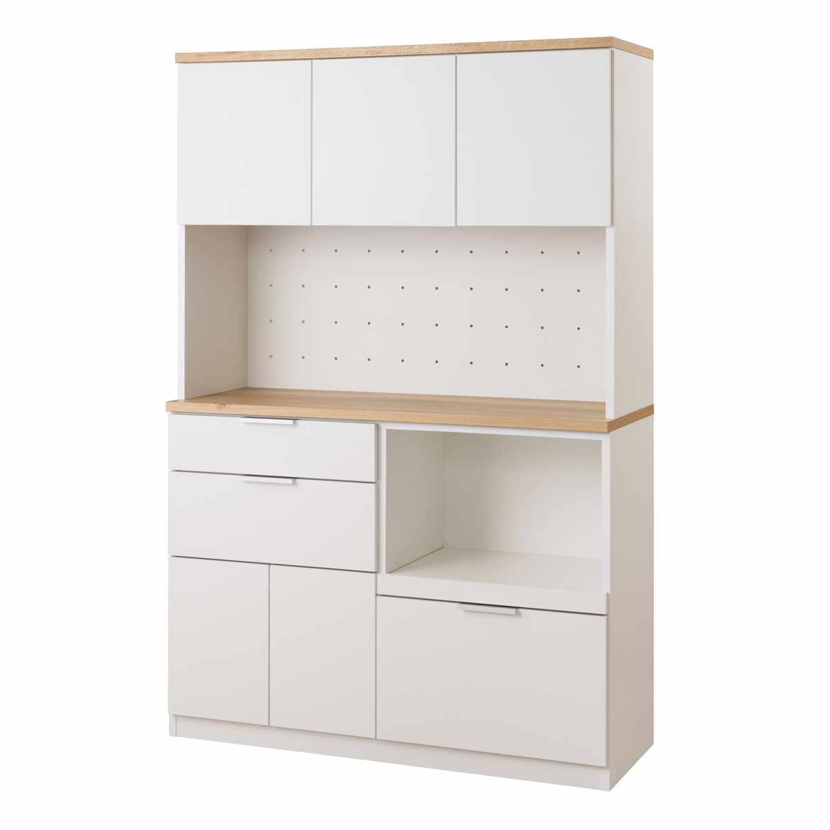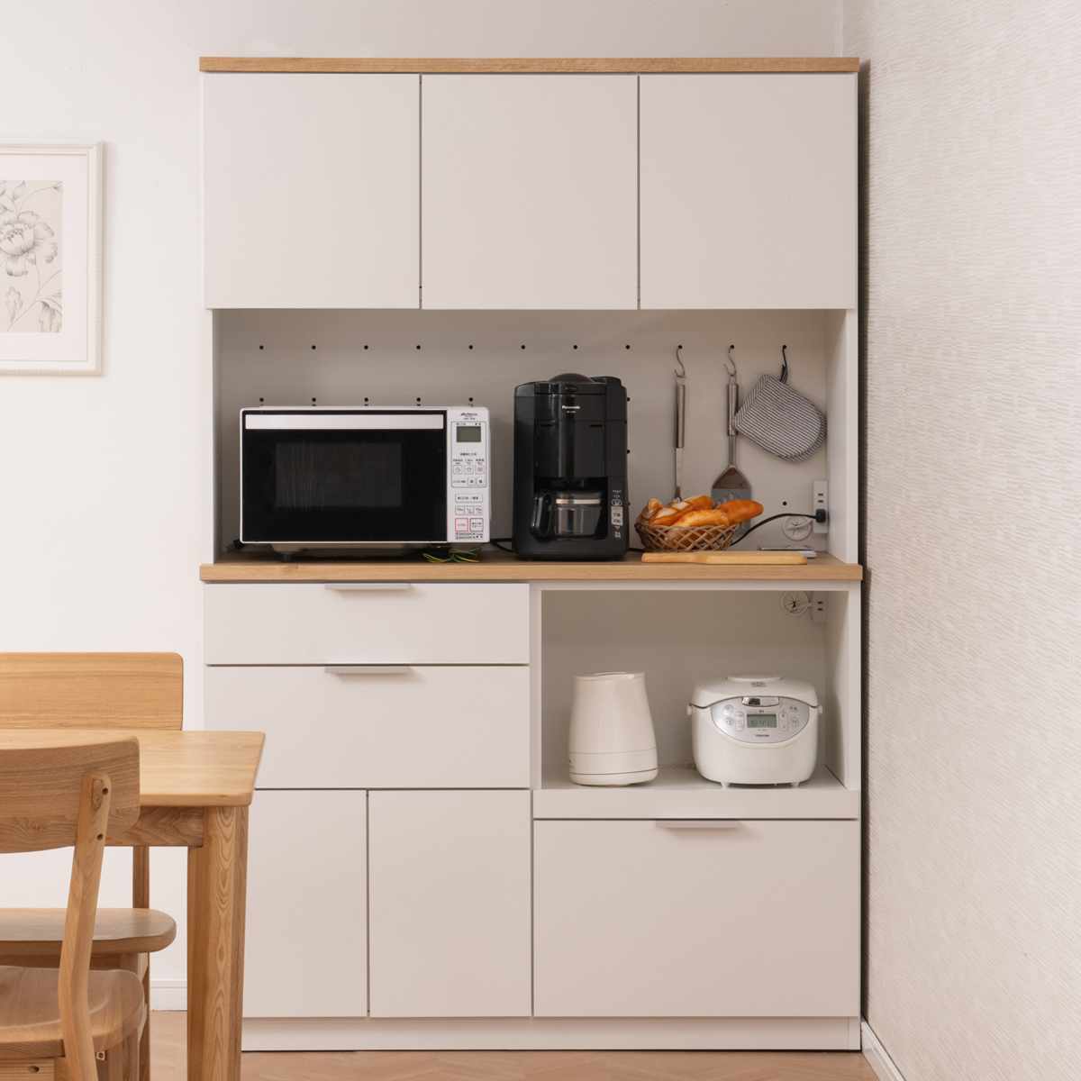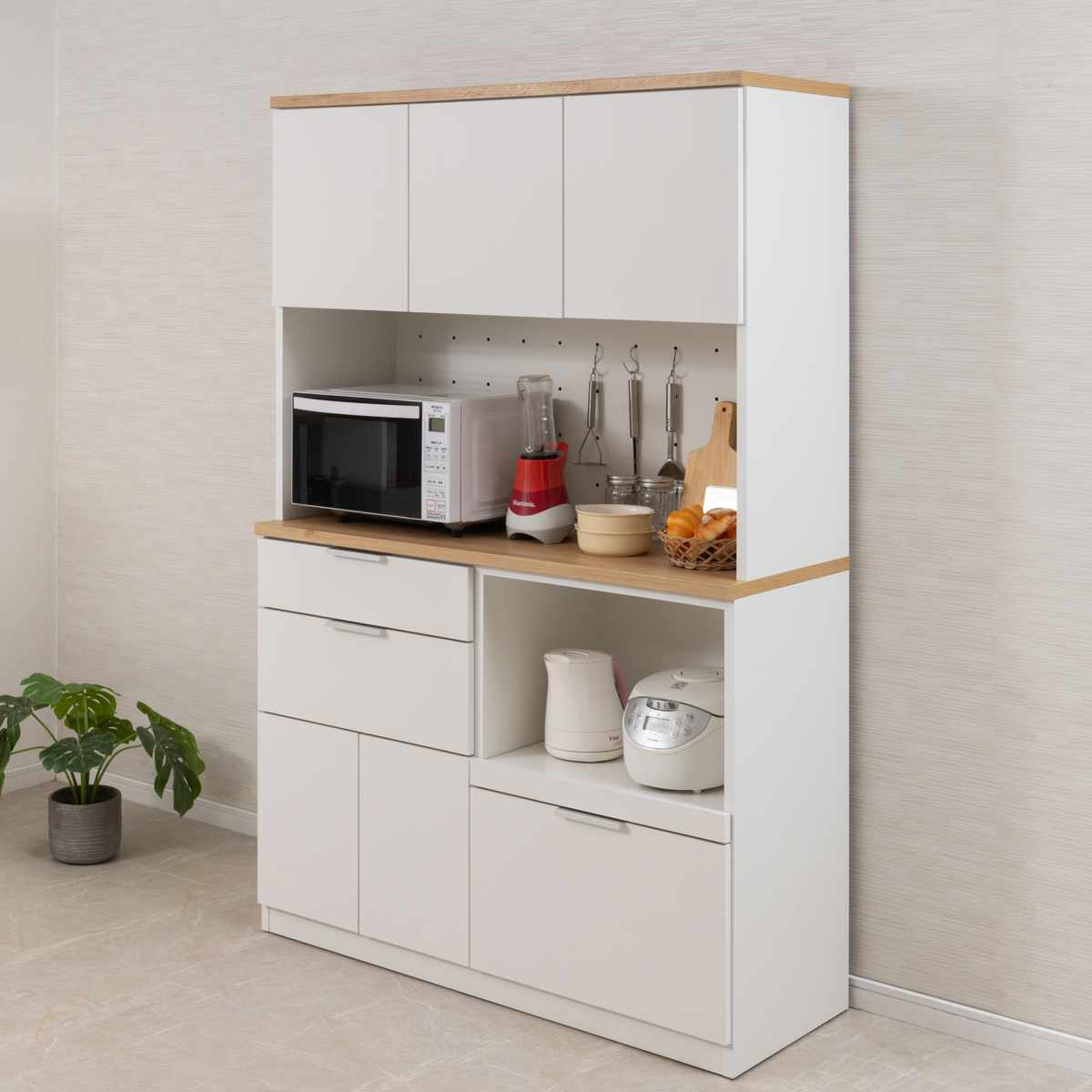 ホワイトと木目調の組み合わせがやさしい印象を与える、上品なキッチンボードです。シンプルながらも洗練されたデザインで、キッチンを明るく爽やかな空間に演出。食器や調理器具、家電などをすっきり収納でき、見た目と機能を両立した一台です。