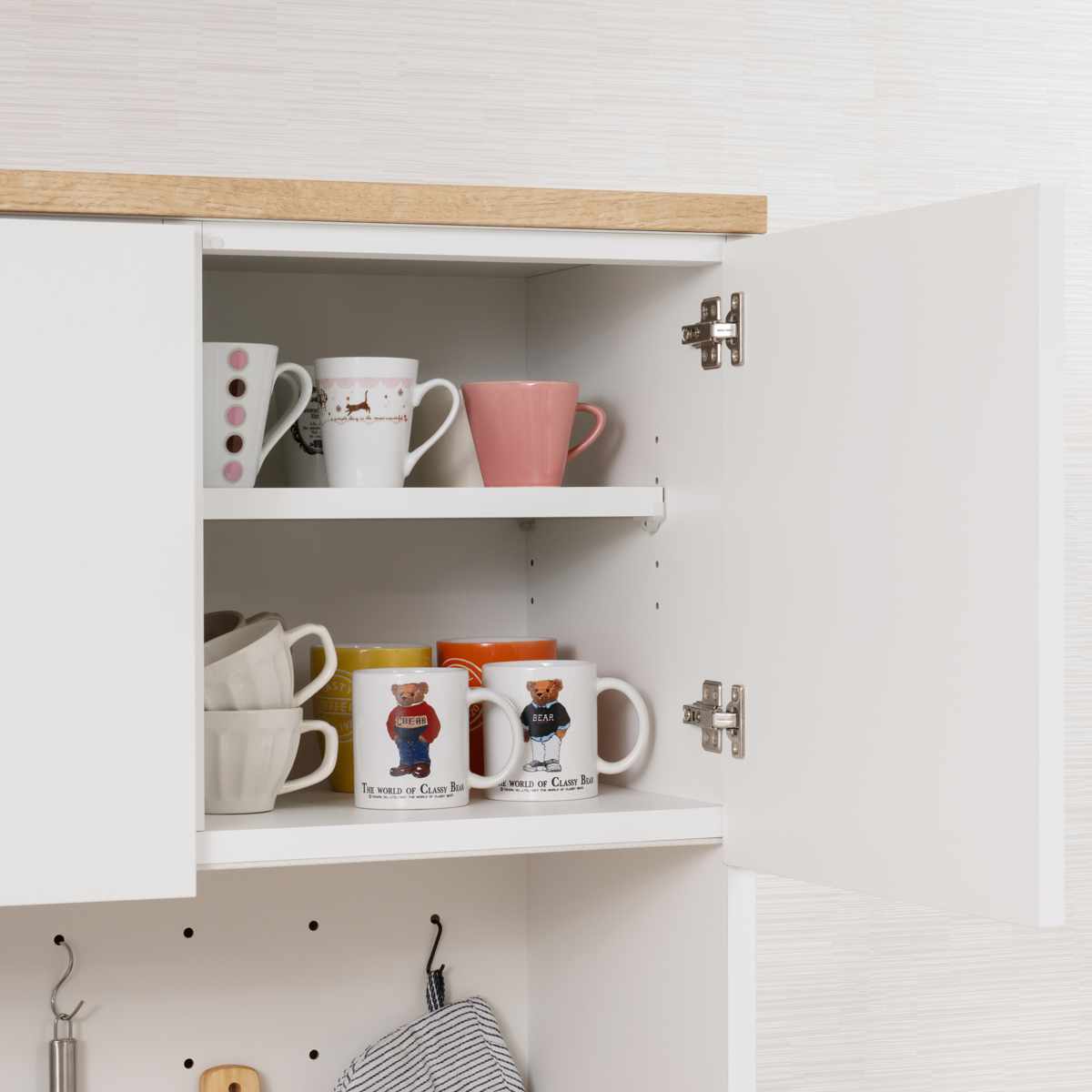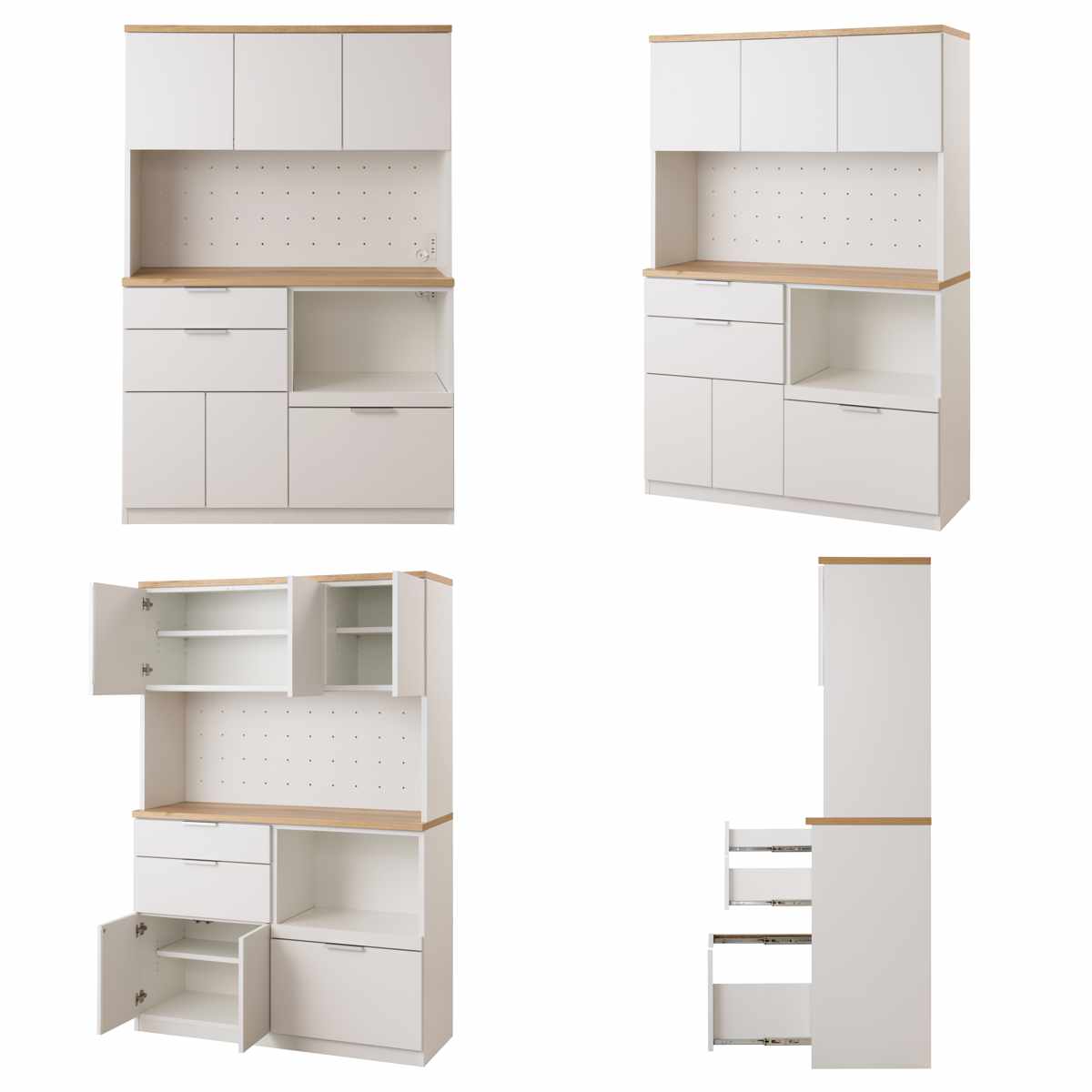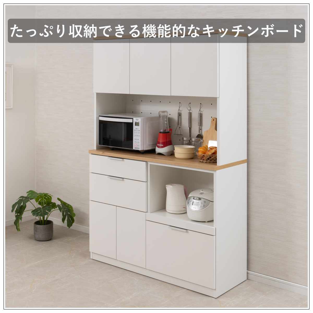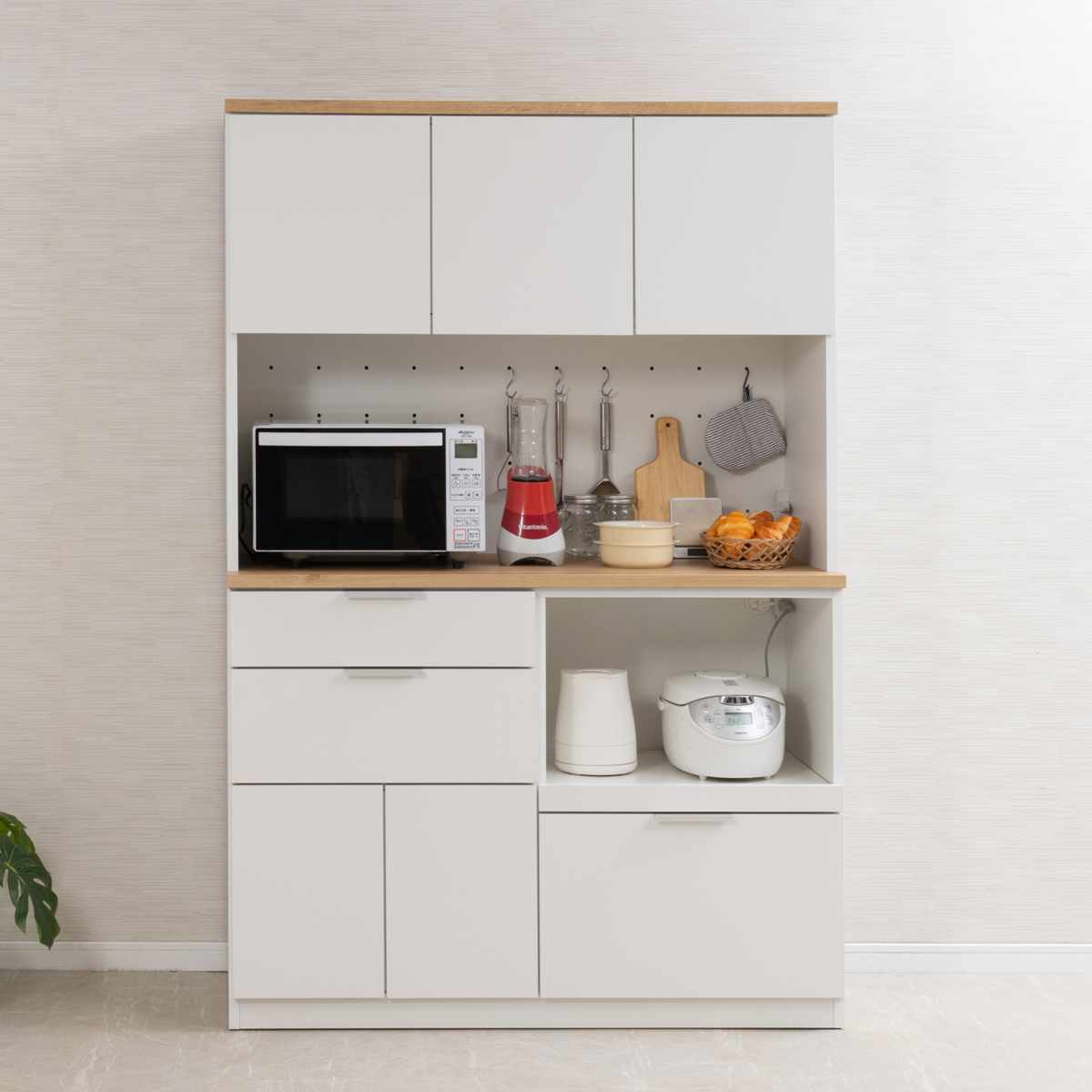 ホワイトと木目調の組み合わせがやさしい印象を与える、上品なキッチンボードです。シンプルながらも洗練されたデザインで、キッチンを明るく爽やかな空間に演出。食器や調理器具、家電などをすっきり収納でき、見た目と機能を両立した一台です。