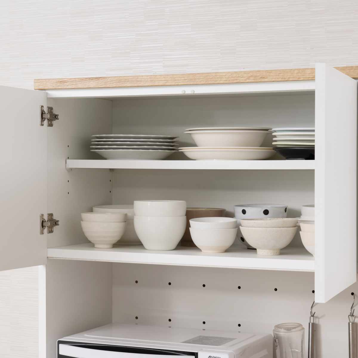 上部の扉内は左右に棚板が各1枚ずつあり、高さを3cm間隔で5段階変えることができます。グラスやお皿、保存容器など、収納する物のサイズに合わせてスッキリと整理可能です。