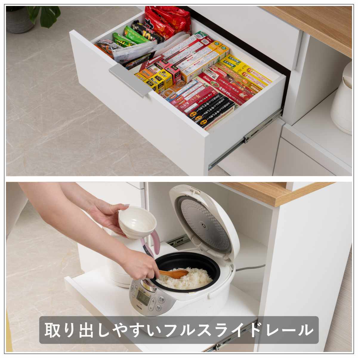 引出しは全段フルスライドレールを採用。奥の物まで見やすく出し入れがしやすいです。スライドレールも最後まで引き出せるので炊飯器のふたもしっかりと開きます。