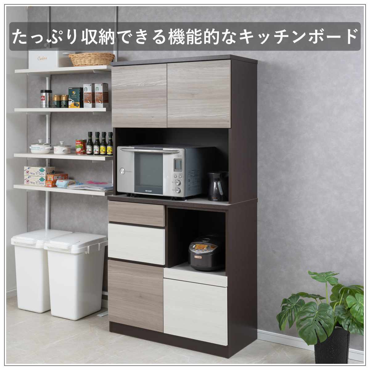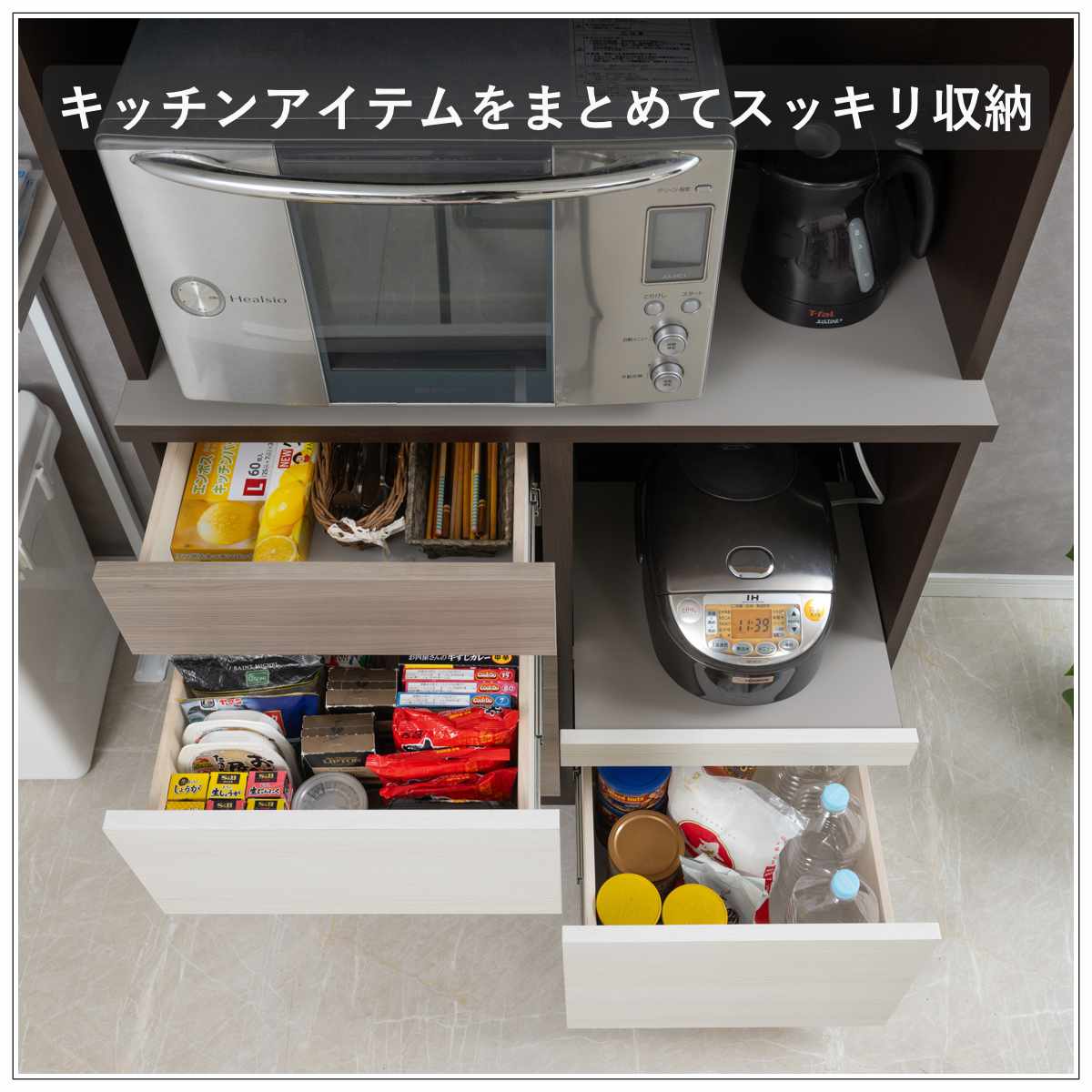 沢山のキッチンアイテムが、 この1台ですっきり収納できます。 食器類や家電製品にキッチン小物食品ストックもまとめて大量収納ができるのが魅力。機能や収納も日本製ならではの考えて造られた高品質のキッチンボードです。