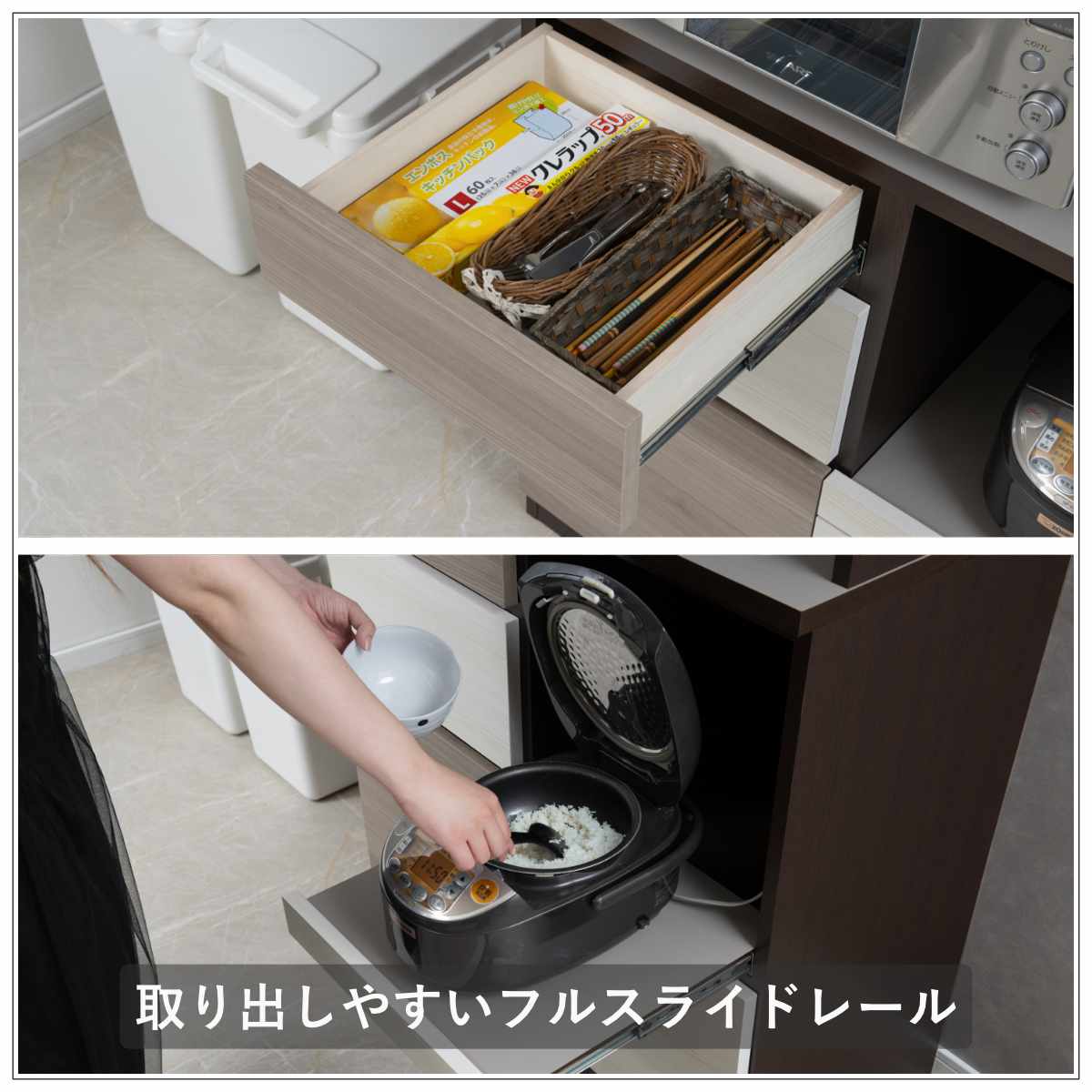 引出しは全段フルスライドレールを採用。奥の物まで見やすく出し入れがしやすいです。スライドレールも最後まで引き出せるので炊飯器のふたもしっかりと開きます。