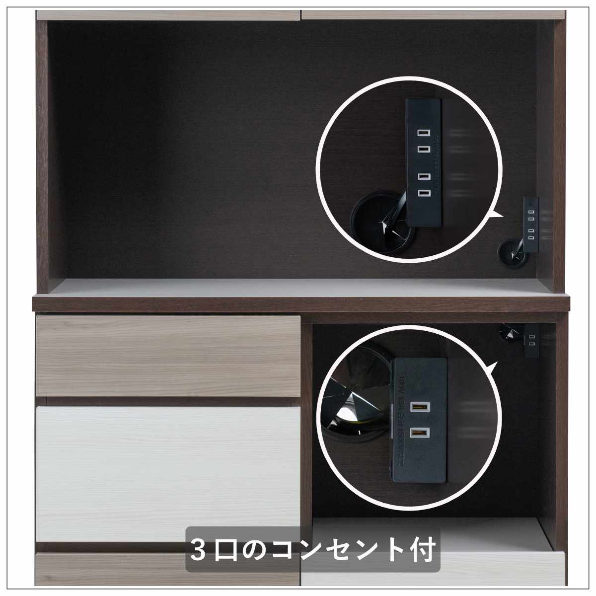 上段に2口、下段に1口の合計3口のコンセント付き。電子レンジや炊飯器、ポットなど複数の家電を同時に使えて便利です。