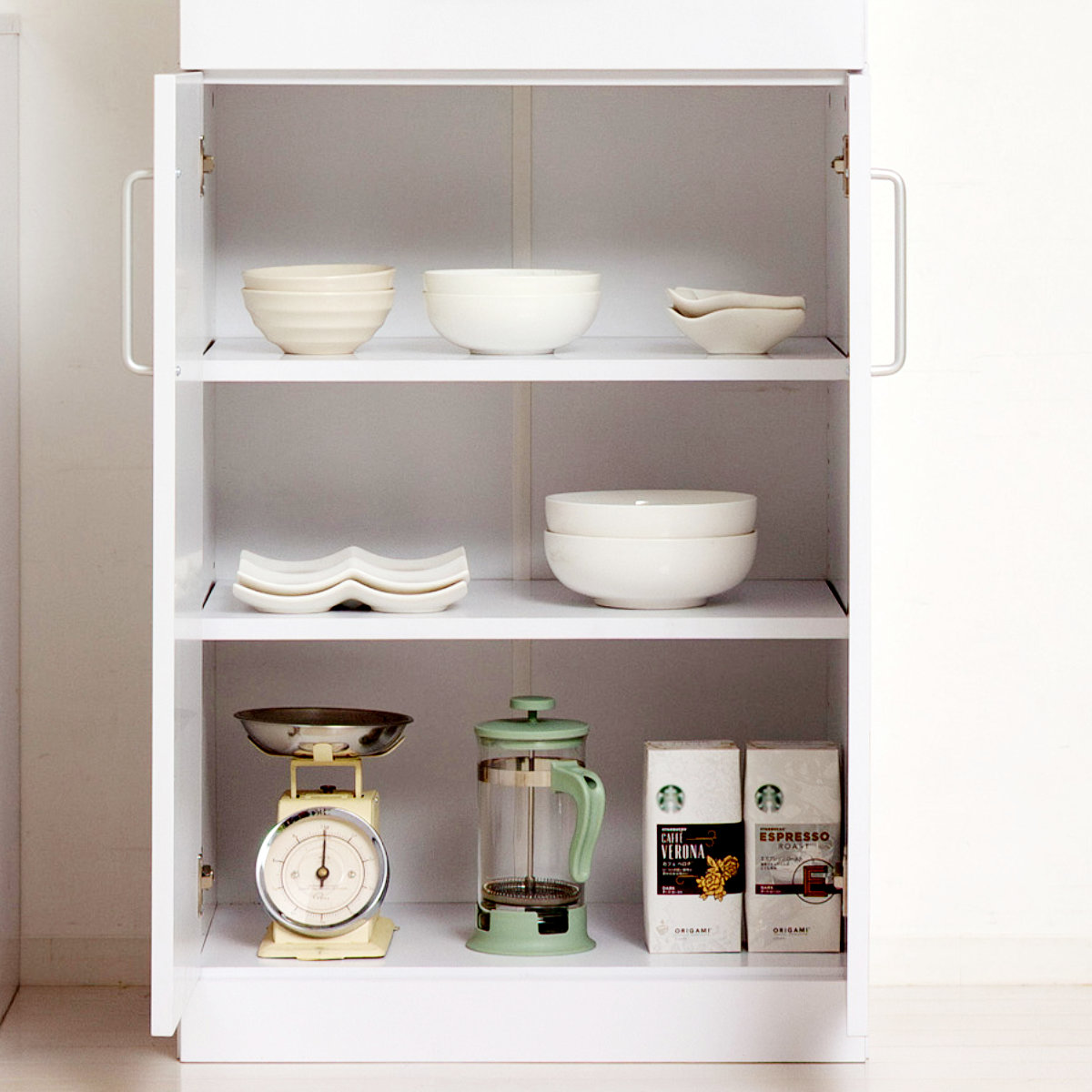 こちらにも可動棚(2枚)が付いており、大きめの食器やお鍋もたっぷり収納でき、食品ストックなど、サイズに合わせて効率良く収納できます。
