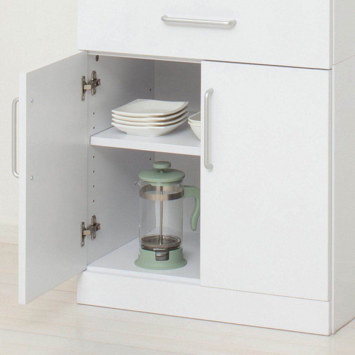 こちらにも可動棚(1枚)が付いており、しっかり収納できる扉付きスペース。大きめの食器やお鍋もたっぷり収納でき、食品ストックなど、サイズに合わせて効率良く収納できます。