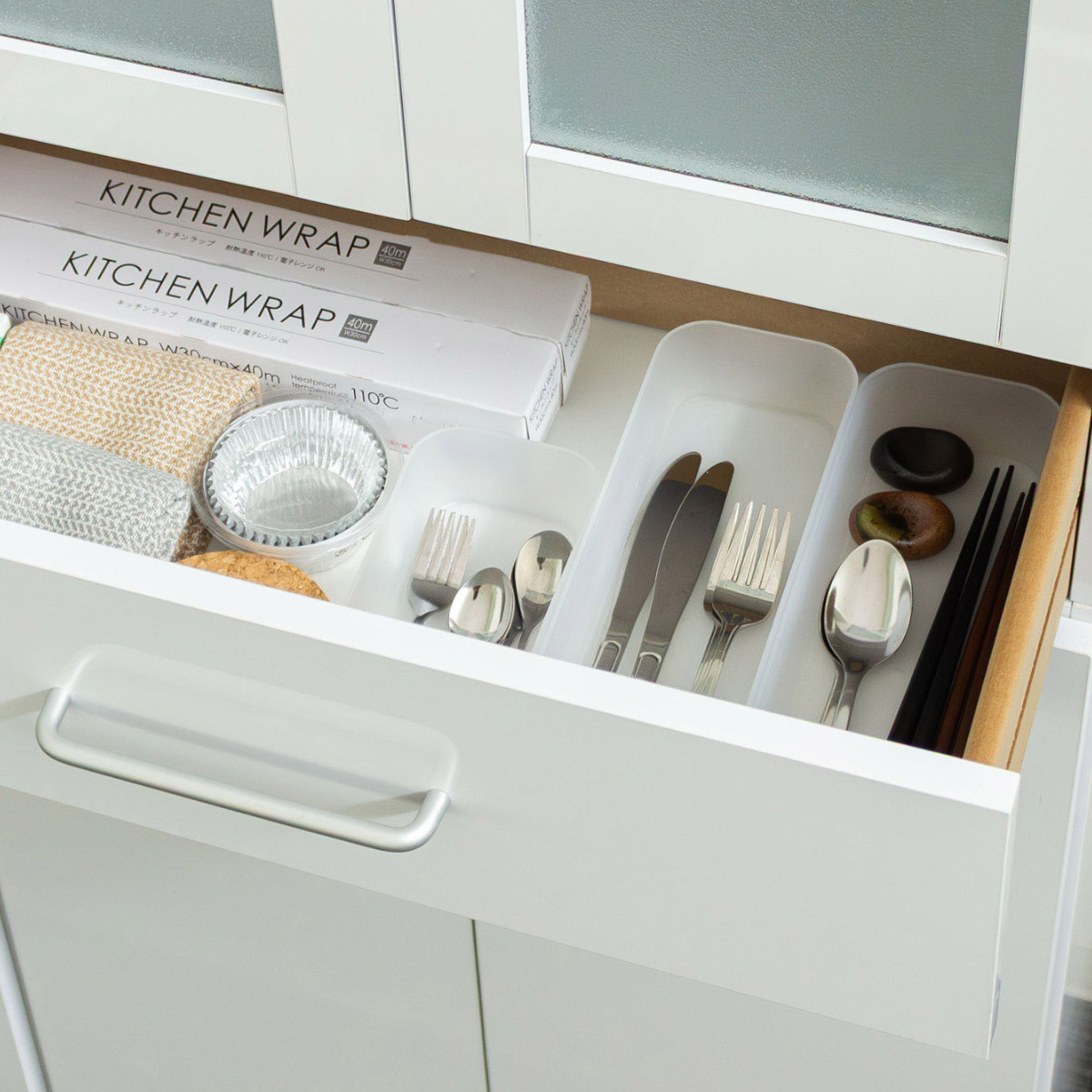 引き出しは抜け落ち防止ストッパー付きで、奥まで引いても外れず安心。重い食器もスムーズに収納でき、小さなお子様のいる家庭でも安全です。