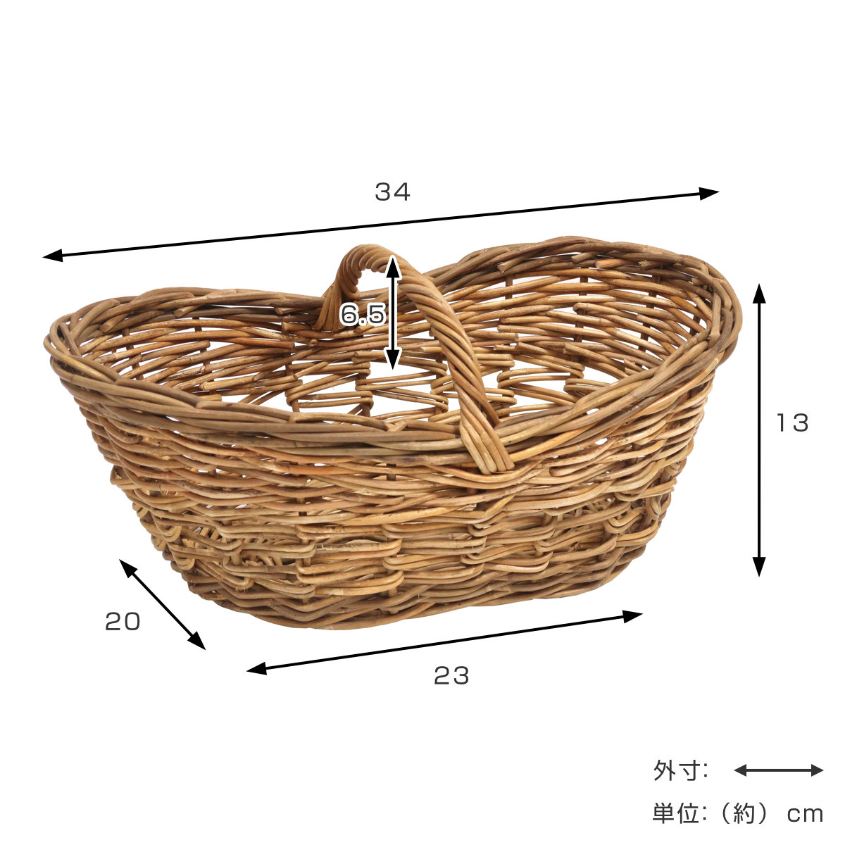 | サイズ | 約 幅34×奥行20×高さ13(cm) 持ち手:高さ6.5cm |