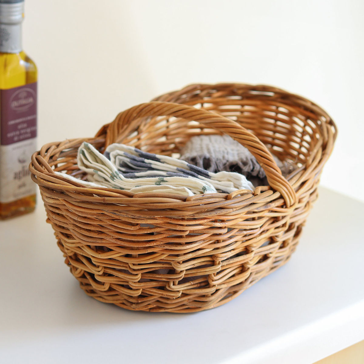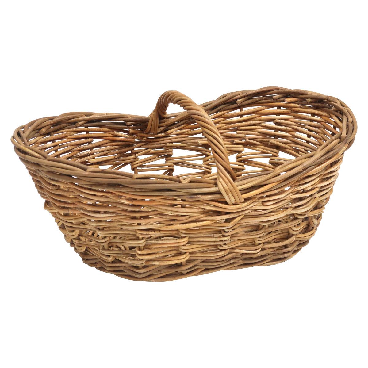 ●天然素材の皮付きラタンを贅沢に使用した、温かみのあるオーバル型のローバスケットです。