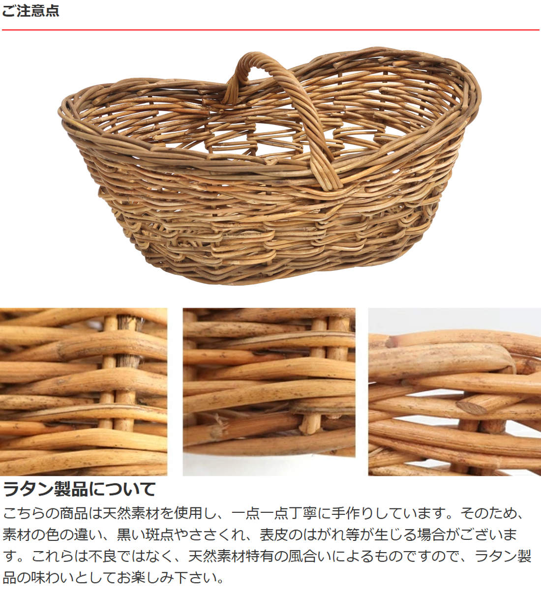 こちらの商品は天然素材を使用し、一点一点丁寧に手作りしています。そのため、素材の色の違い、黒い斑点やささくれ、表皮のはがれ等が生じる場合がございます。これらは不良ではなく、天然素材特有の風合いによるものですので、ラタン製品の味わいとしてお楽しみ下さい。