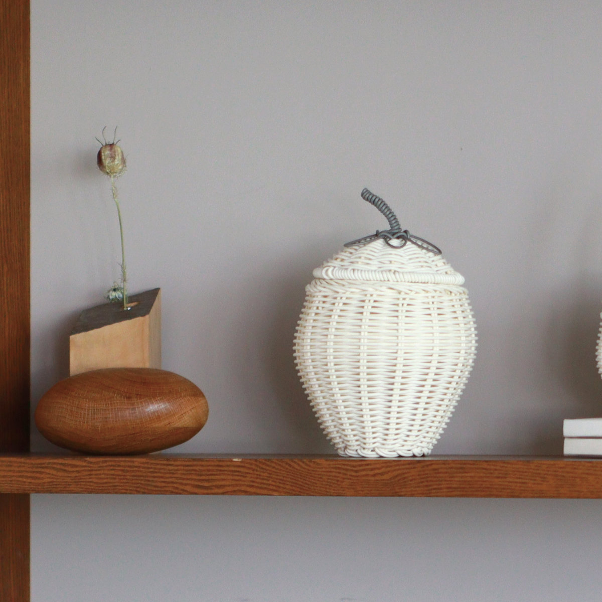 ちょこんと乗った「ヘタ」の部分が愛らしい、ストロベリー型です。日常の細かなものをすっきりと隠せる万能サイズで、綿棒やコットンなど、洗面台まわりの収納や、キッチンでは小袋調味料の整理にもおすすめです。