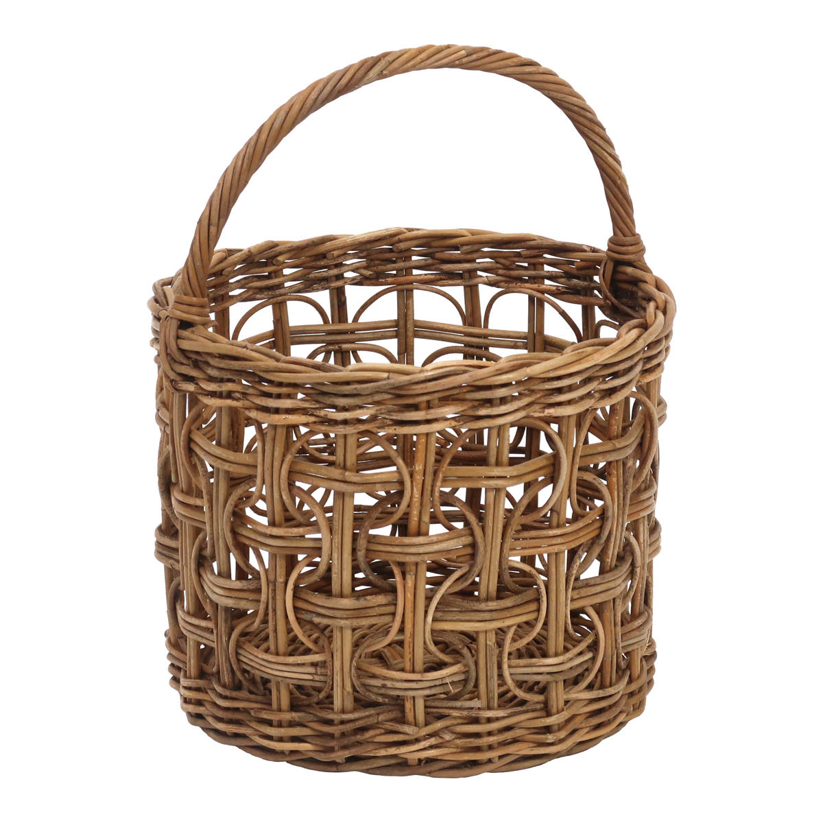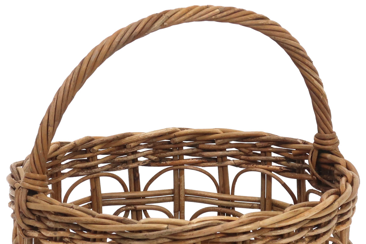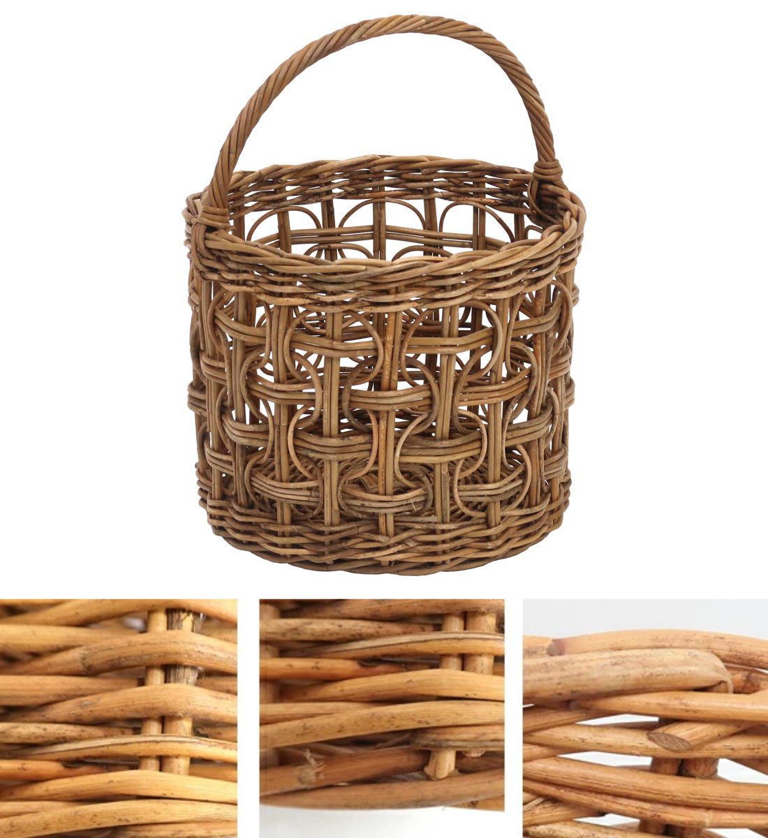 天然素材の皮付きラタンを贅沢に使用した、温かみのあるループ編みラウンド型バスケットです。デザイン性の高い透かし編みがポイントで、インテリアに温かみとナチュラルな雰囲気を演出します。